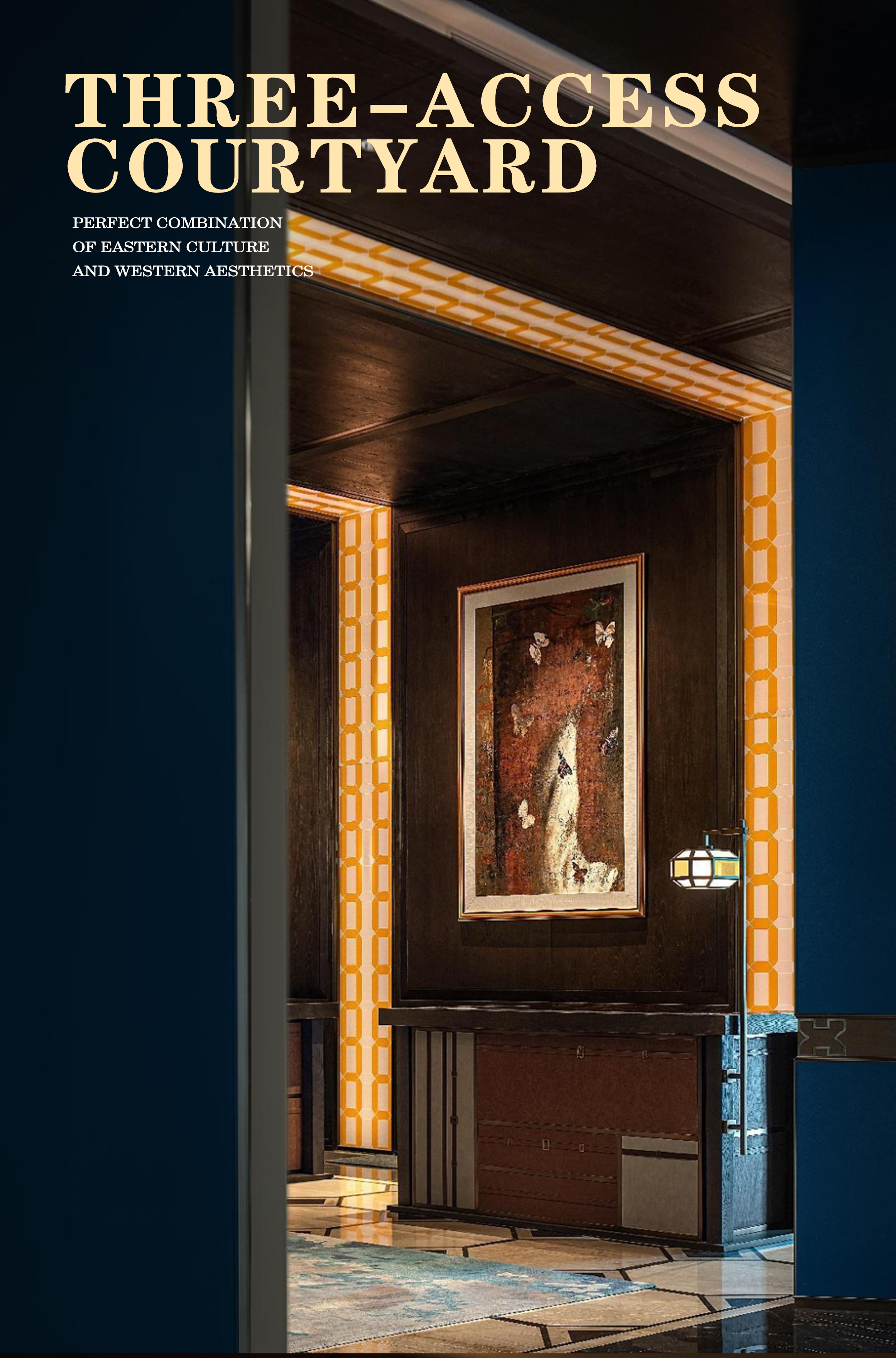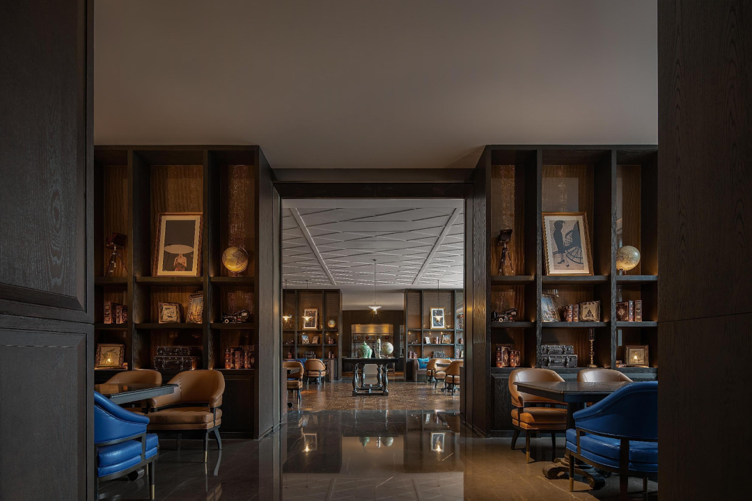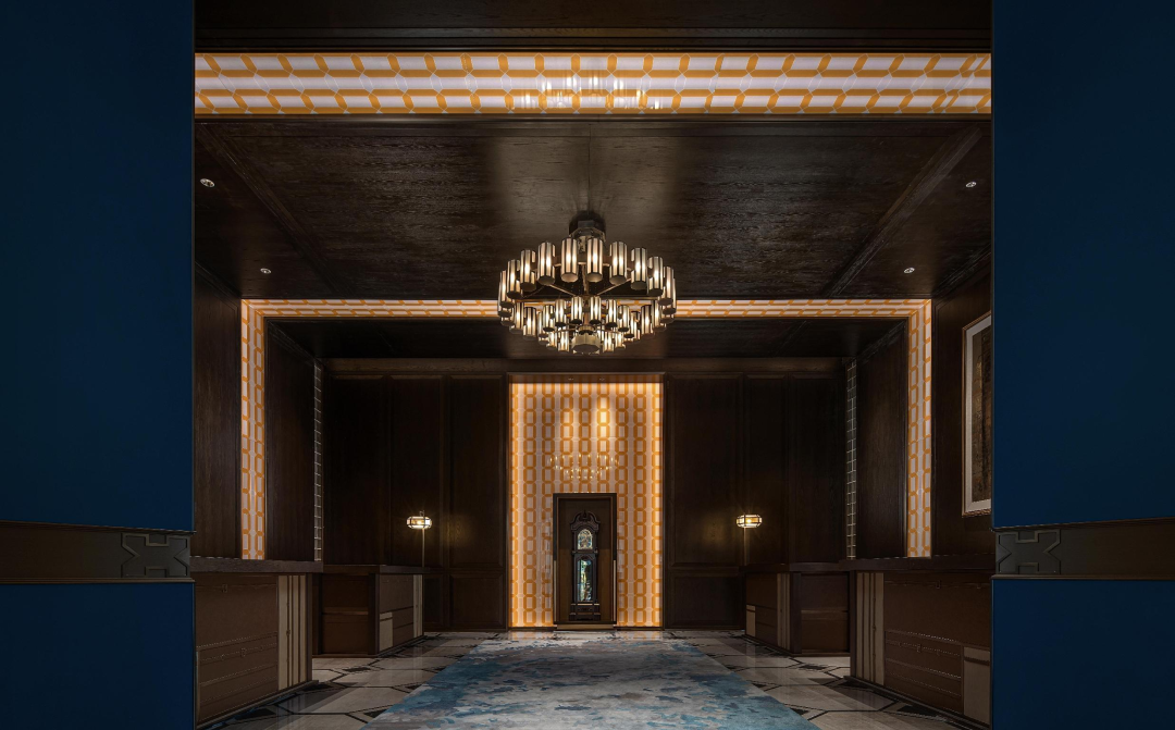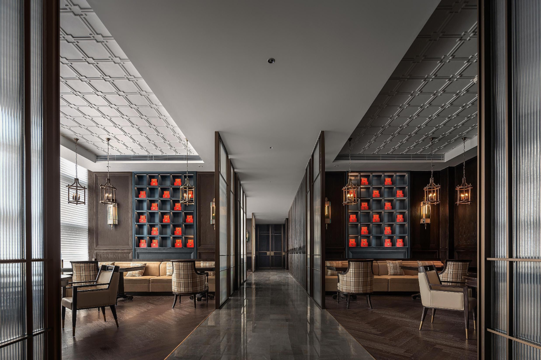 接待區(qū)是整個(gè)三進(jìn)院空間的一個(gè)變奏,在這里深色的西式墻板從墻面延伸至天花,細(xì)細(xì)彩色的玻璃窗,由皮箱的組成的接待臺(tái)后面穿著旗袍的女士在靜靜等著的歸來(lái)。