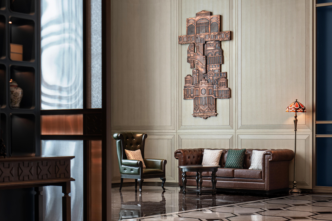 進(jìn)入客房首先映入眼簾的同樣是具有時(shí)代感的彩色玻璃,同時(shí)墻面的西式線條搭配中式家具,同樣訴說(shuō)著古老東方與西方的相遇。