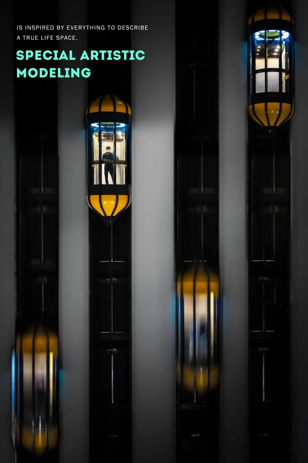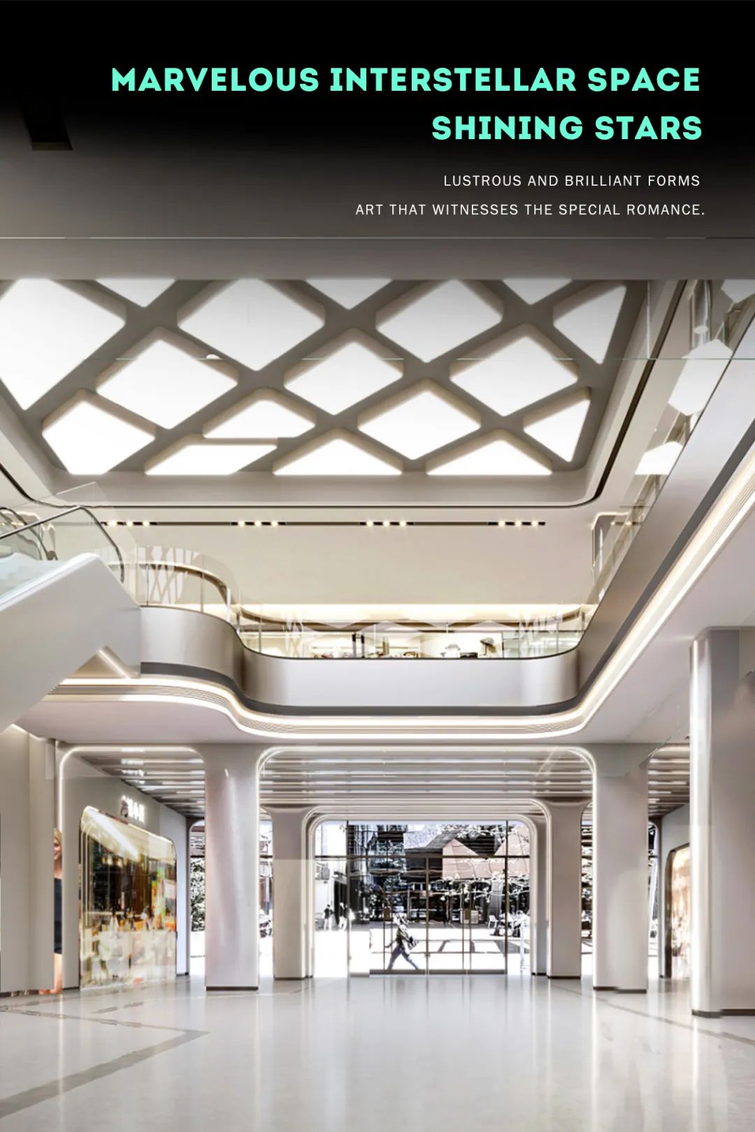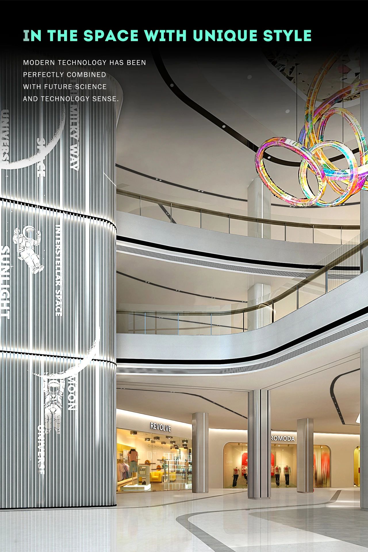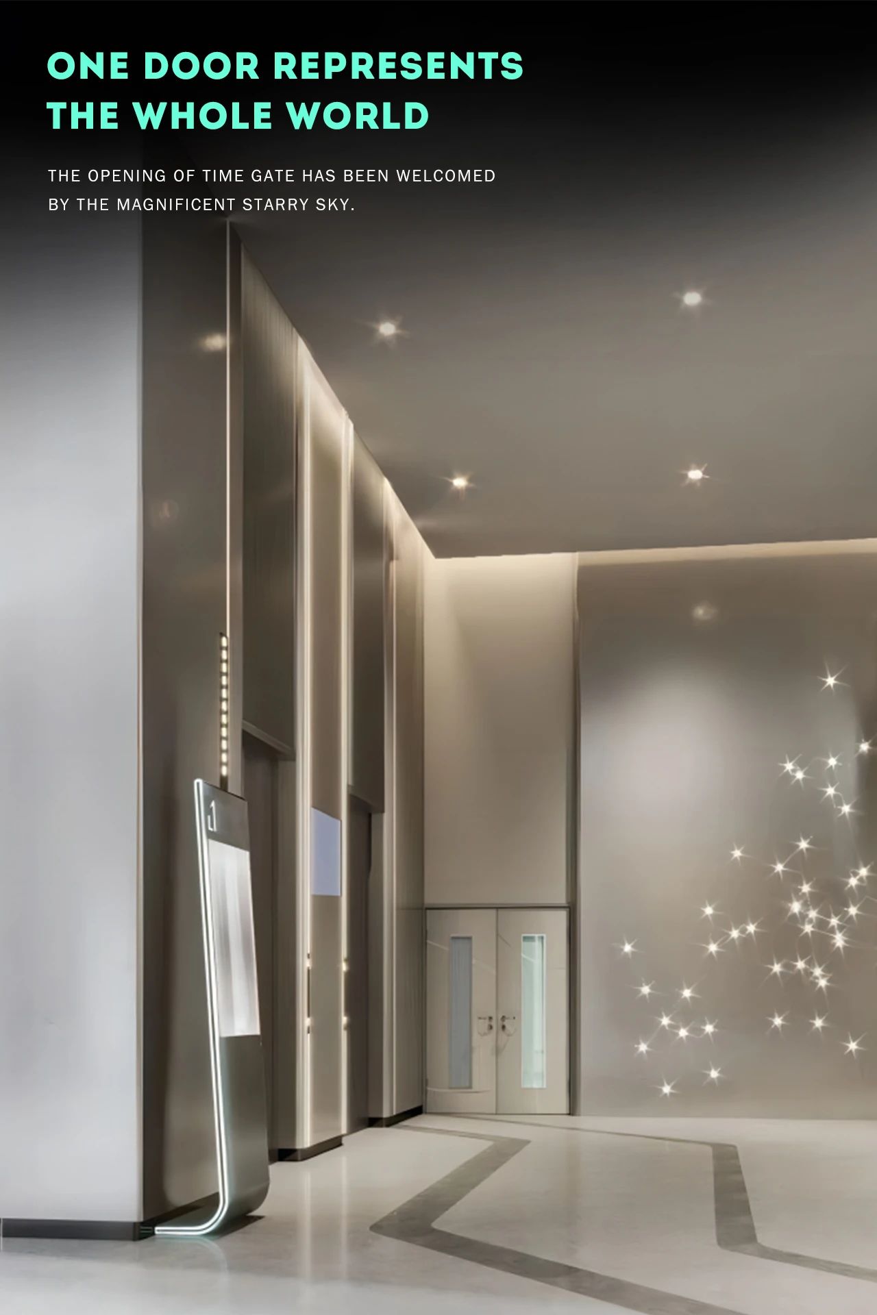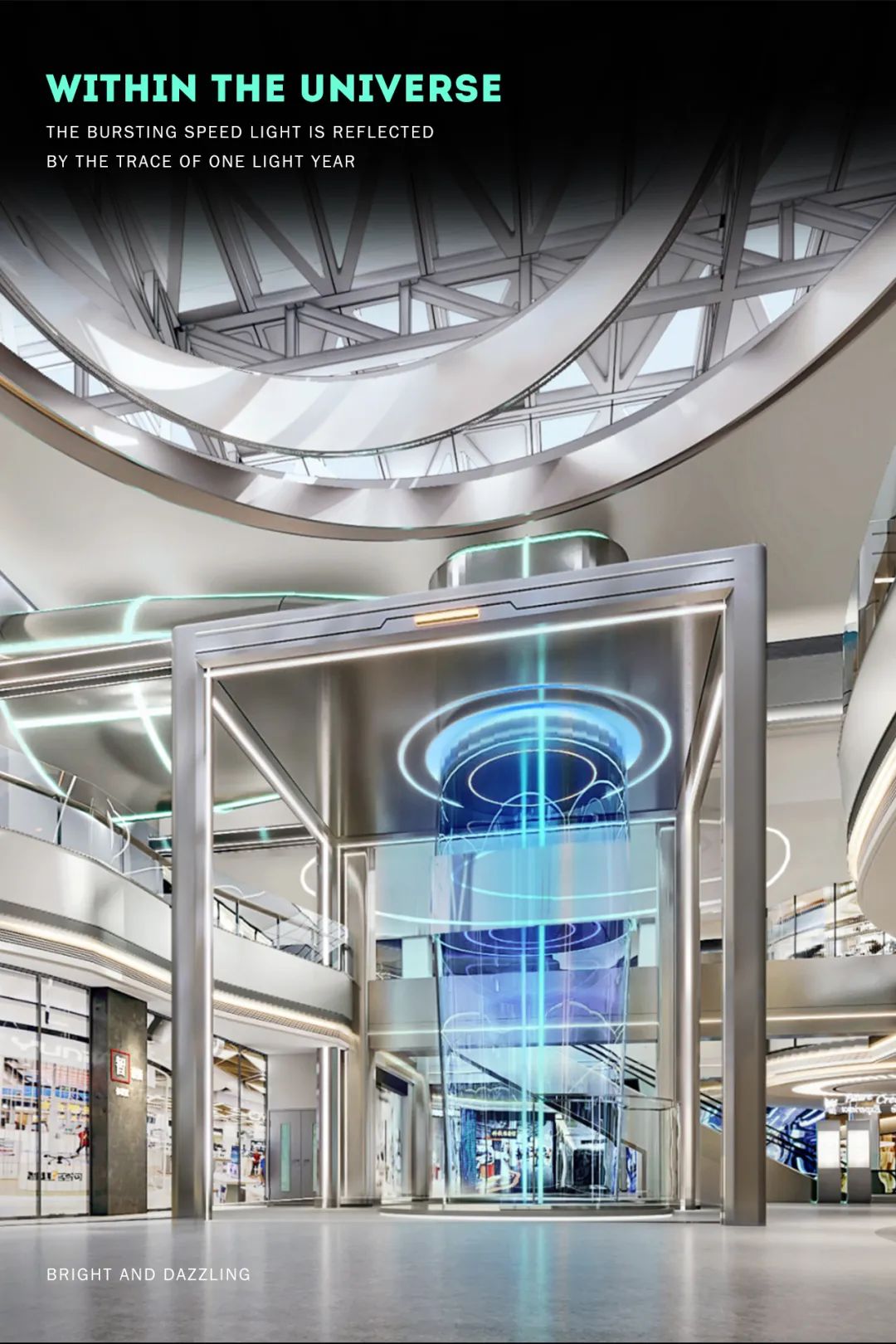 每層標(biāo)識(shí)位置加入LED星光燈,韻律般的閃爍如同宇宙繁星,出每一層電梯都感覺(jué)到達(dá)了不同的星系。穿越星云到達(dá)前沿外星城市,體驗(yàn)外太空游樂(lè)購(gòu)物之旅。