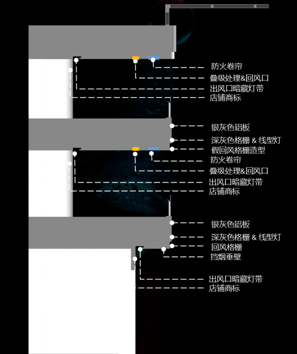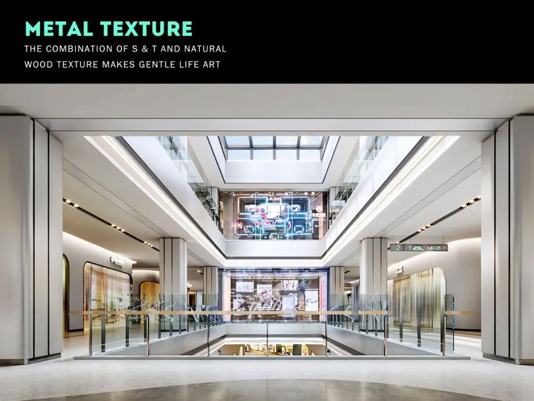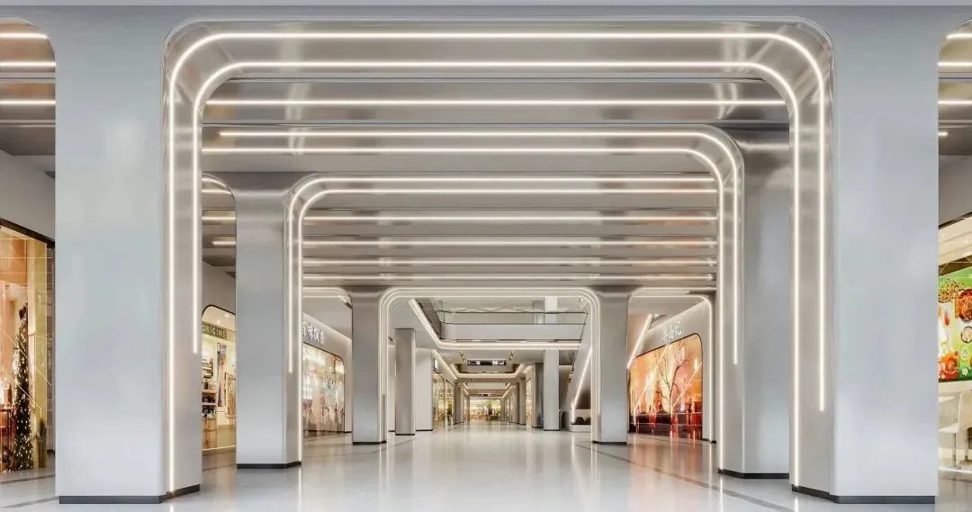 通過(guò)金屬材質(zhì)的反射質(zhì)感和LED線性燈條打造成富含感科技入口,從這里進(jìn)入商場(chǎng)有一種登入未來(lái)太空飛船的體驗(yàn)感。