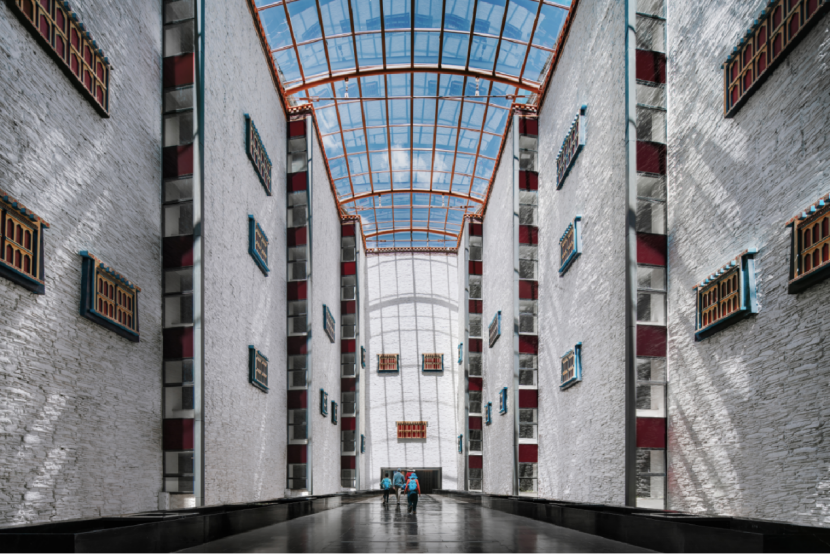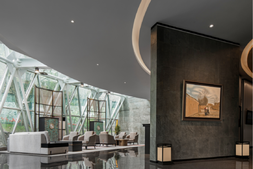 接待大堂江河設(shè)計(jì)JHD希望將故事從自然生態(tài)過(guò)渡到對(duì)于迷人的地域風(fēng)情。通過(guò)對(duì)當(dāng)?shù)氐某浞终{(diào)研,江河設(shè)計(jì)JHD保留了藏式迷人的色彩印象,用當(dāng)下工藝去詮釋藏式的邊瑪墻、融合極具天然質(zhì)感的薄石材板,同時(shí)將地域元素、文化進(jìn)行提煉整理點(diǎn)綴到空間中。同時(shí)創(chuàng)造性在首層接待大堂空間中置入畫(huà)廊,畫(huà)廊中的畫(huà)作均為藝術(shù)家為酒店創(chuàng)作的系列作品,將酒店的歷史風(fēng)貌及地域風(fēng)情展示出來(lái)。