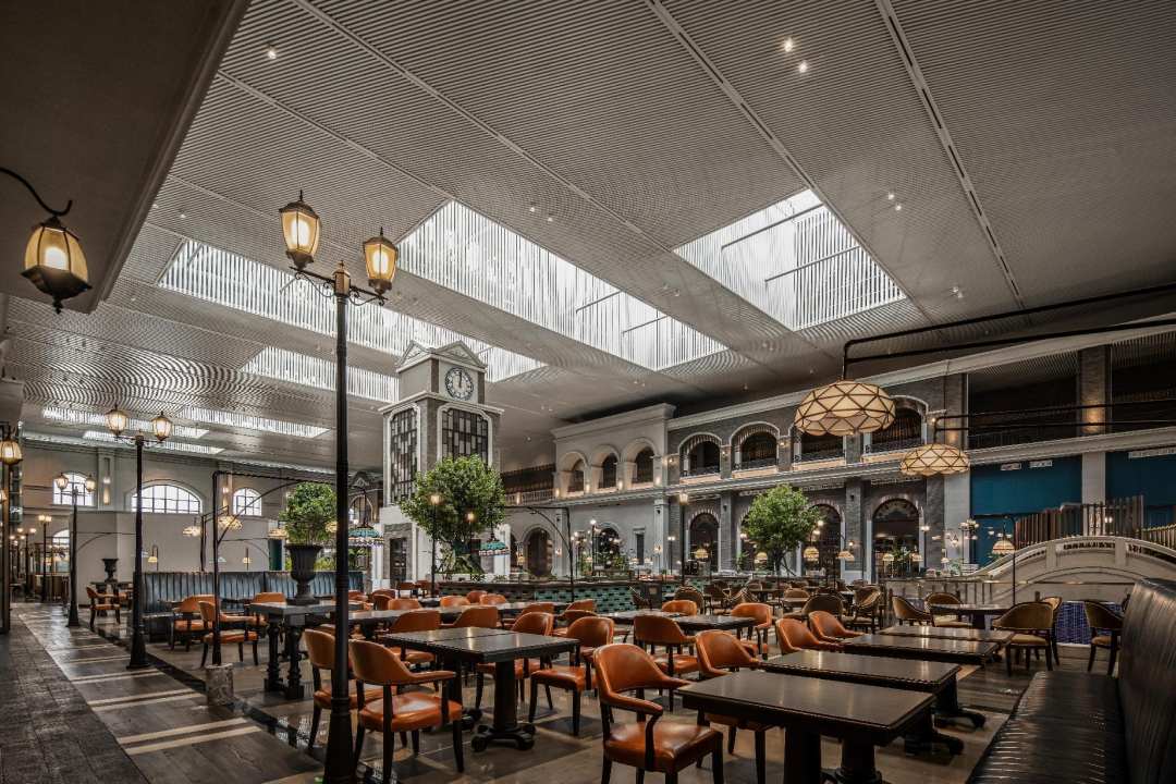 鐘樓做為民國時(shí)期市中心的一個(gè)重要地標(biāo),被運(yùn)用到共享大堂的中心廣場位置,廣場的設(shè)計(jì)是民國時(shí)代的城市建設(shè)縮影,共享大堂做為施柏閣大觀酒店與皇冠酒店的大堂吧及全日餐使用,立面上使用軟磁材料,塑造民國風(fēng)立面,打造民國街區(qū),伴隨著悠悠的鐘聲將人民帶回那個(gè)激蕩而浪漫的年代。