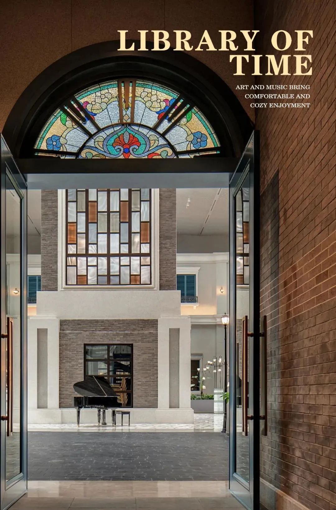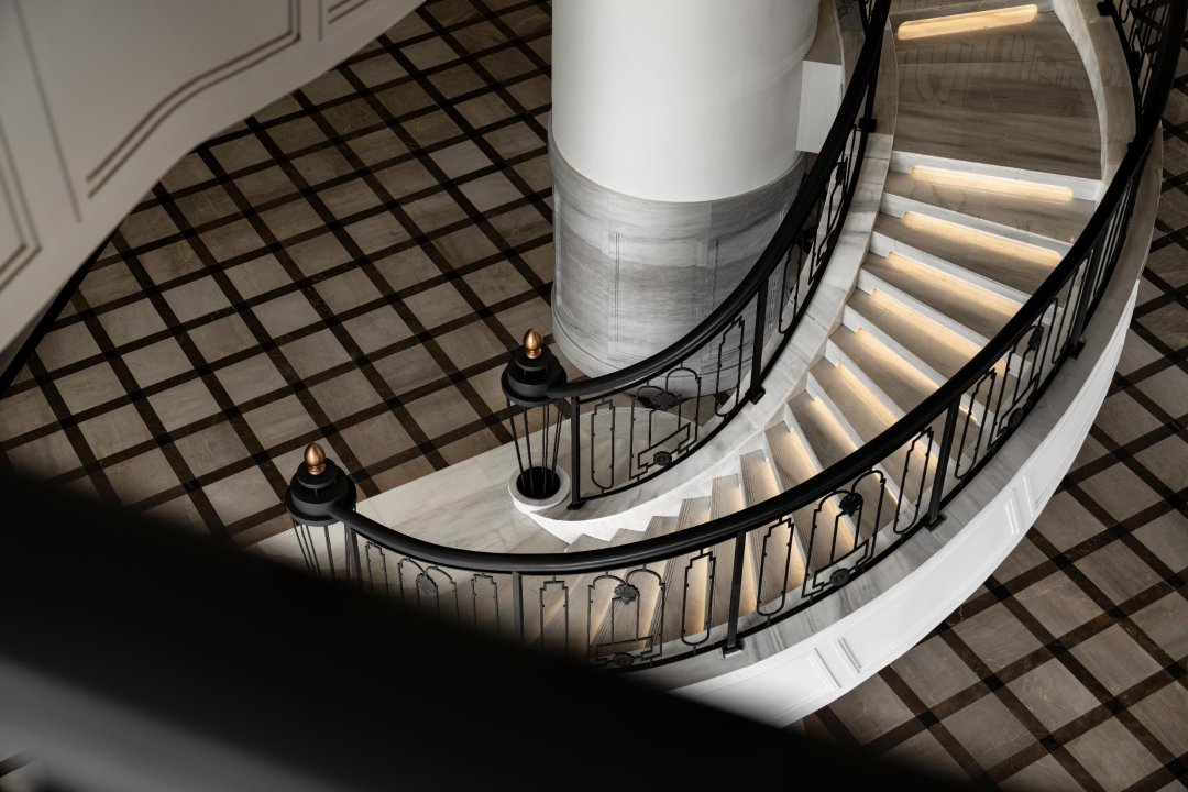 進(jìn)入藝術(shù)大堂,優(yōu)雅的旋轉(zhuǎn)樓梯,精致的西式線條搭配棋盤式的石材鋪貼,優(yōu)美的穹頂下,復(fù)古而不失時(shí)尚的藝術(shù)吊燈,周圍環(huán)繞著是極具序列感的拱窗,每一個(gè)元素的運(yùn)用都透露著深深的時(shí)代烙印。