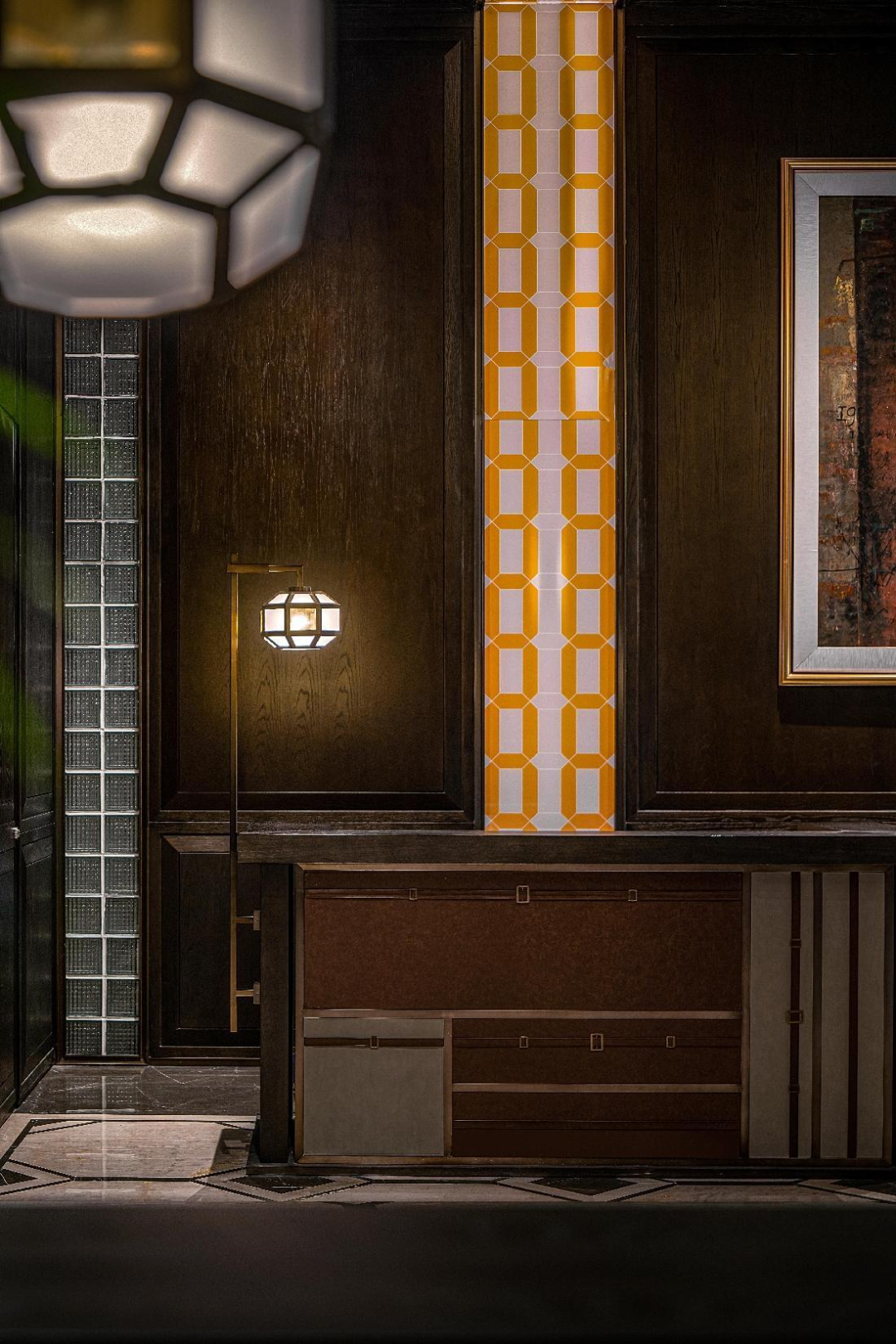 接待區(qū)是整個(gè)三進(jìn)院空間的一個(gè)變奏,在這里深色的西式墻板從墻面延伸至天花,彩色的玻璃窗,由皮箱的組成的接待臺后面穿著旗袍的女士在靜靜等著的歸來。