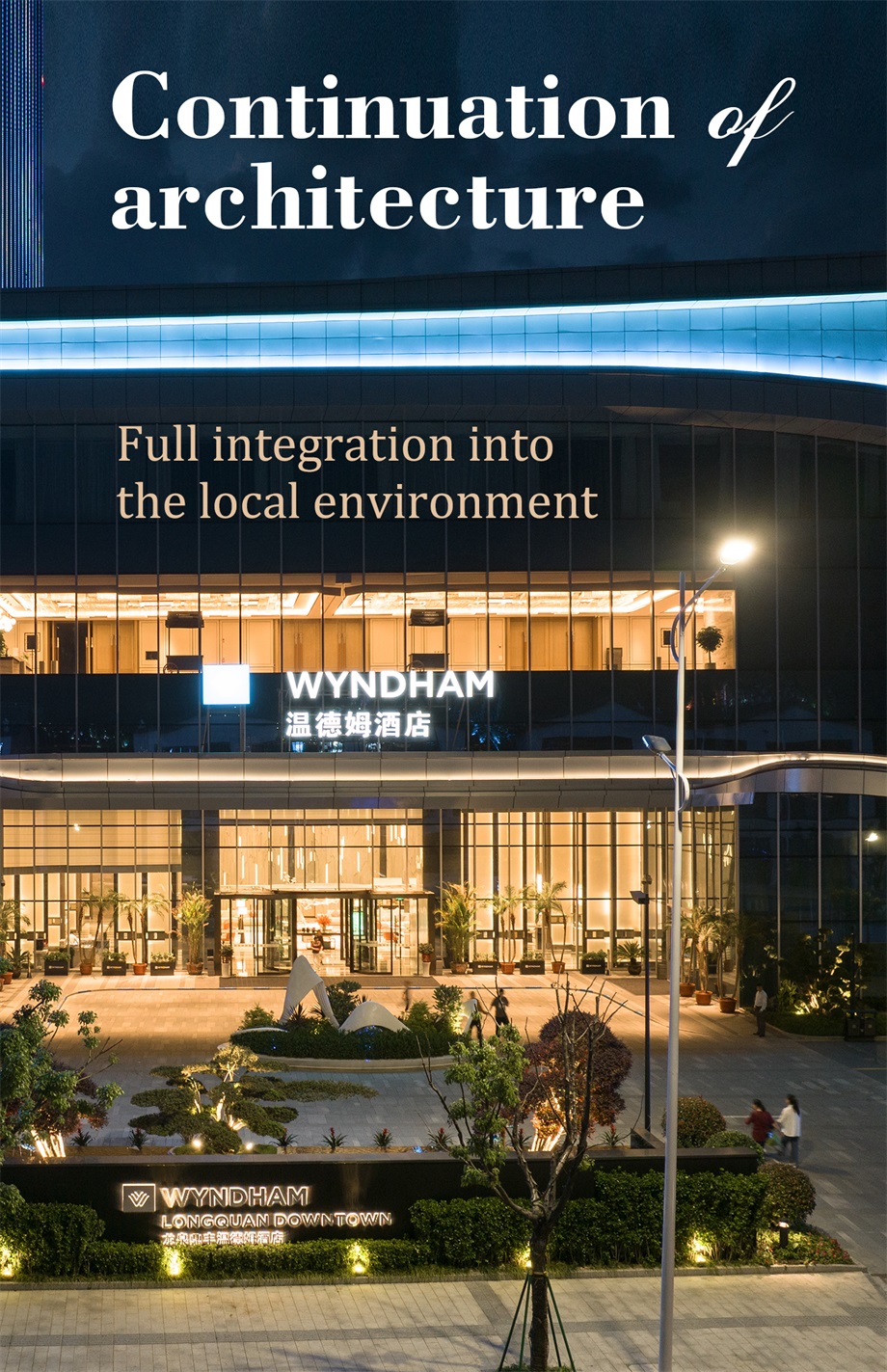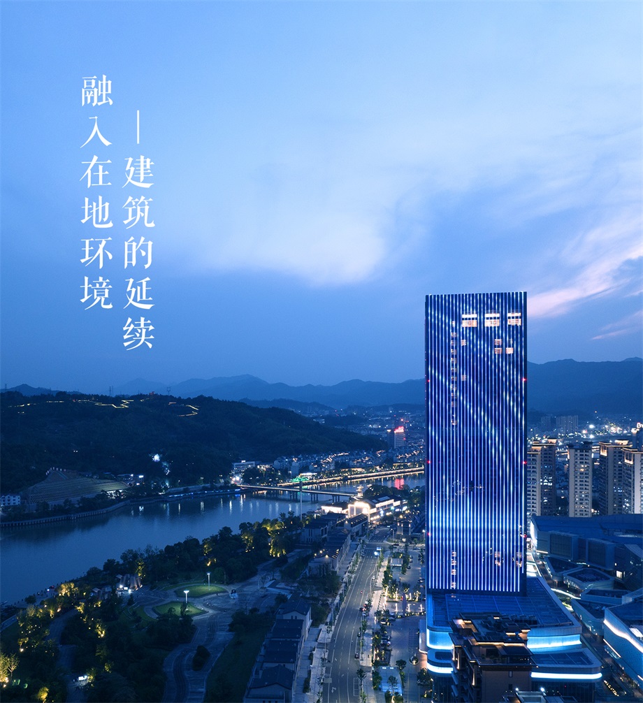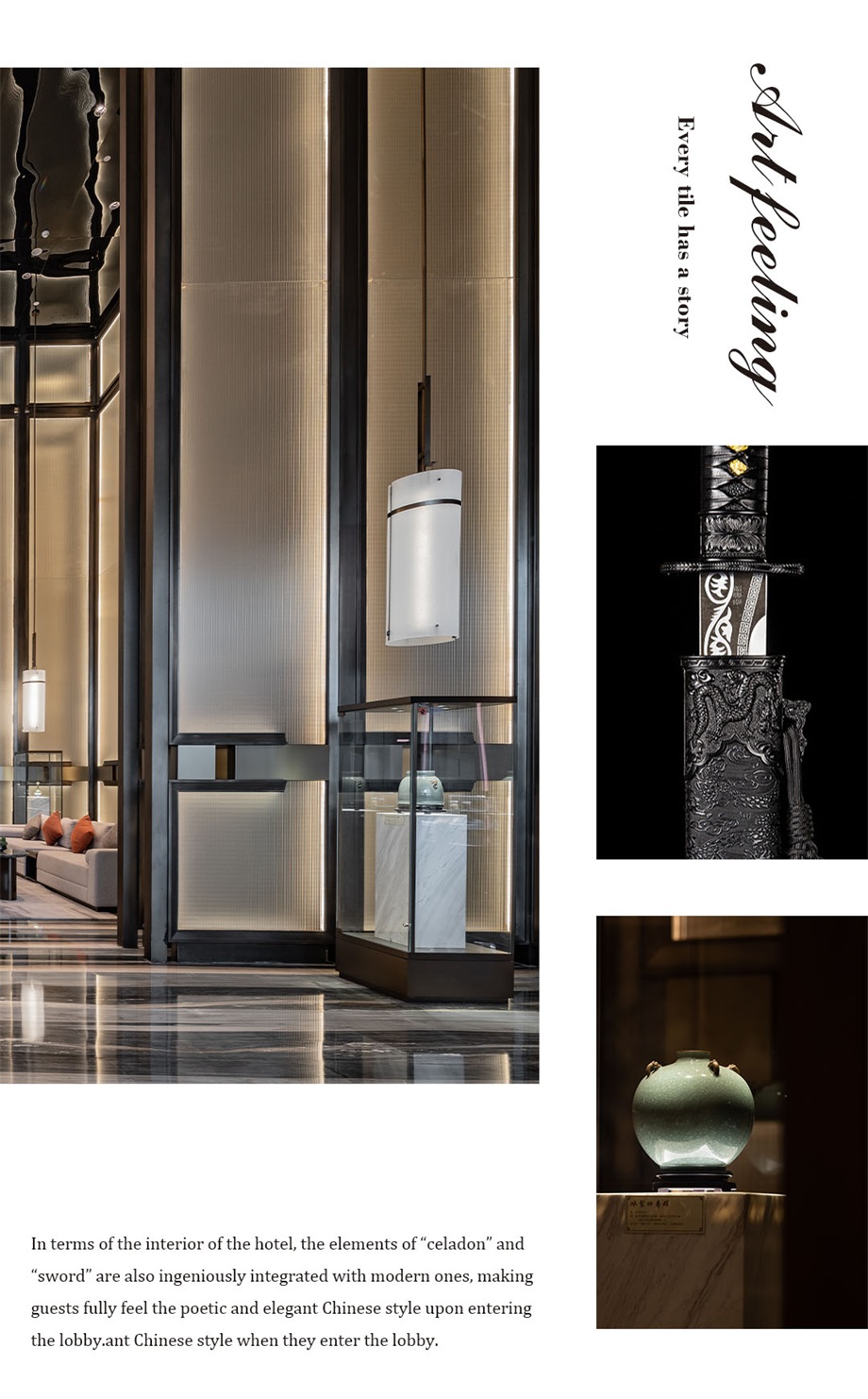設(shè)計汲取龍泉哥窯、弟窯文化,將青瓷曲線糅合于建筑線條之中,將冰裂紋元素融于立面肌理,外觀新穎獨特。在酒店內(nèi)飾上,“青瓷”、“寶劍”元素與現(xiàn)代材質(zhì)同樣做了巧妙的融合,賓客踏入大堂瞬間,即沉浸于龍泉文化的雋永韻味之中。