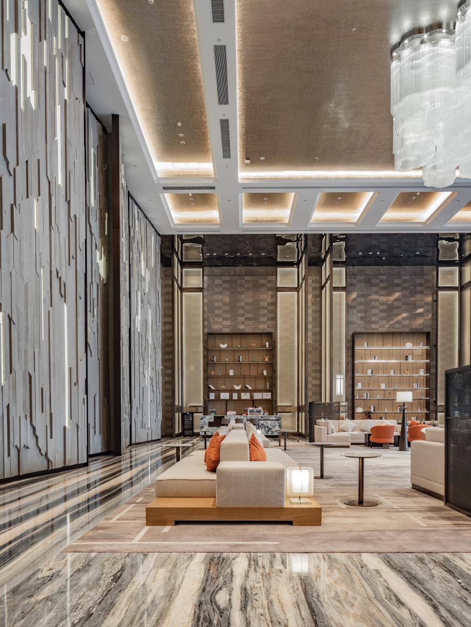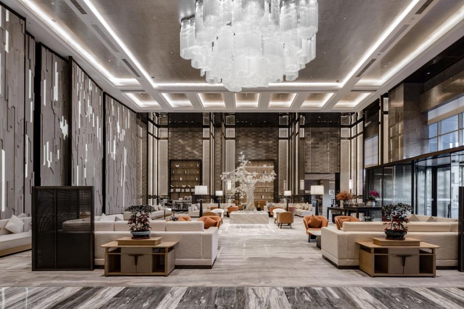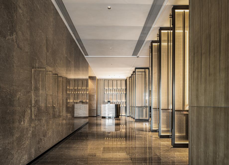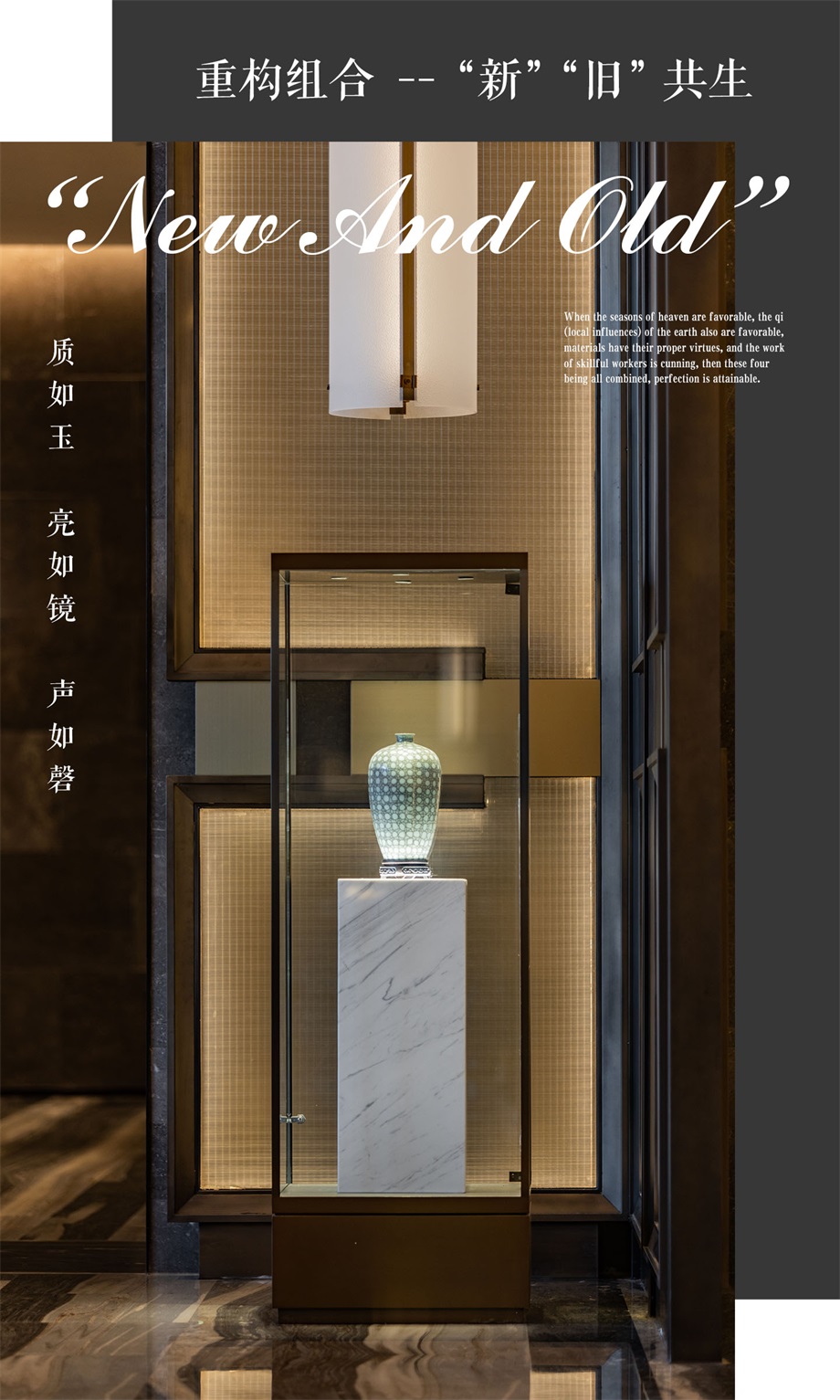 Celadon craft in Longquan City (high and premium quality, brightness and sound design) is a bright pearl of Longquan culture. This traditional process is incorporated into the design of DingfengWyndham Hotel, to create an amazing lobby space.The lobby is not only full of celadon elements, but also shows the celadon process flow in Longquan City, presenting every link, ranging from ingredients to kiln.In particular, glazing and bisque firing are regarded as the distinctive process steps and have become a source of inspiration for hotel design.