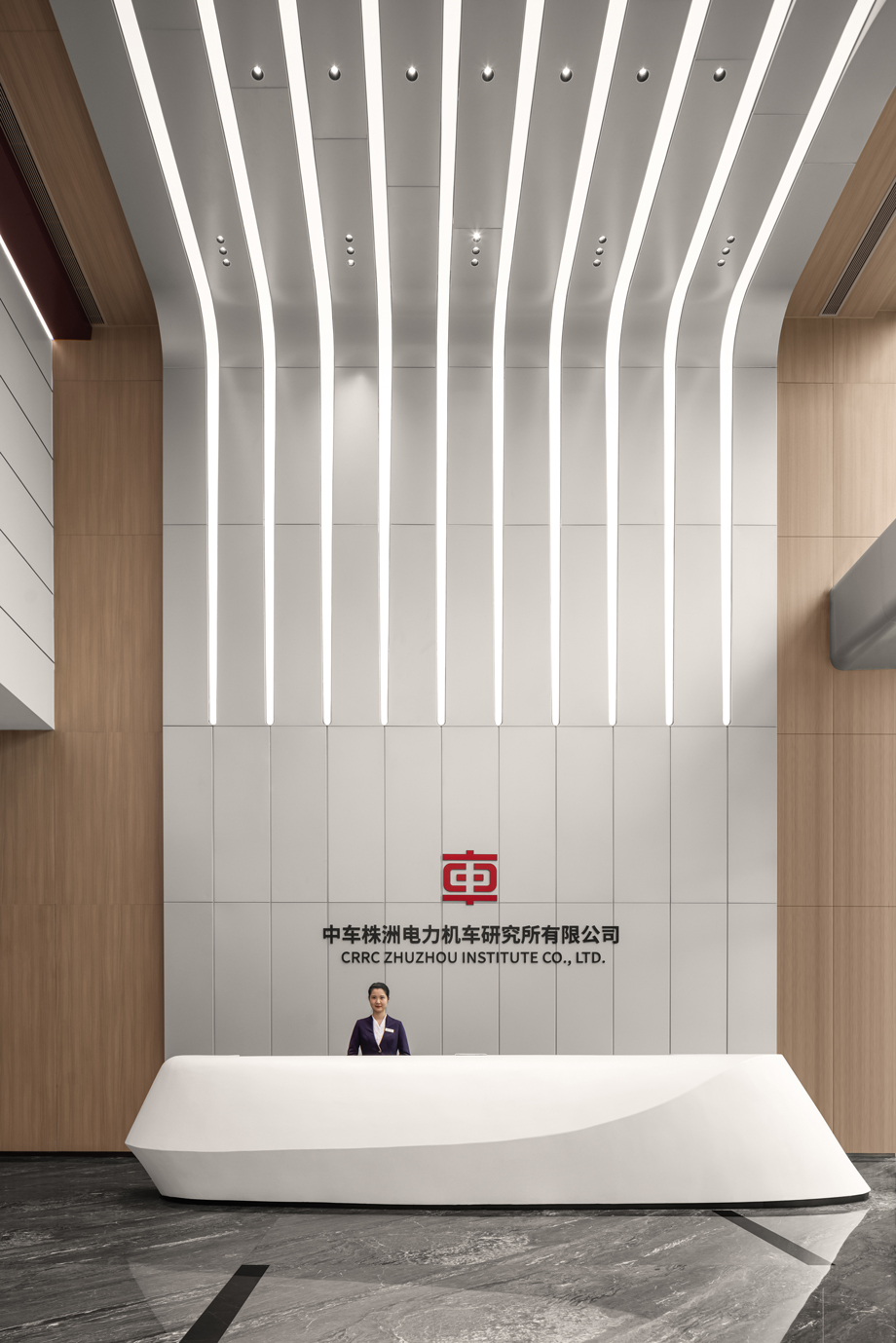 The corridor is made modern, grand and warm through design, which integrates CRRC elements into the ceiling. Through integrated design of wall surface and ceiling as well as orderly arrangement of various elements, the original long and monotonous corridor is upgraded into a space with obvious layer of layering and full of ceremonial atmosphere.