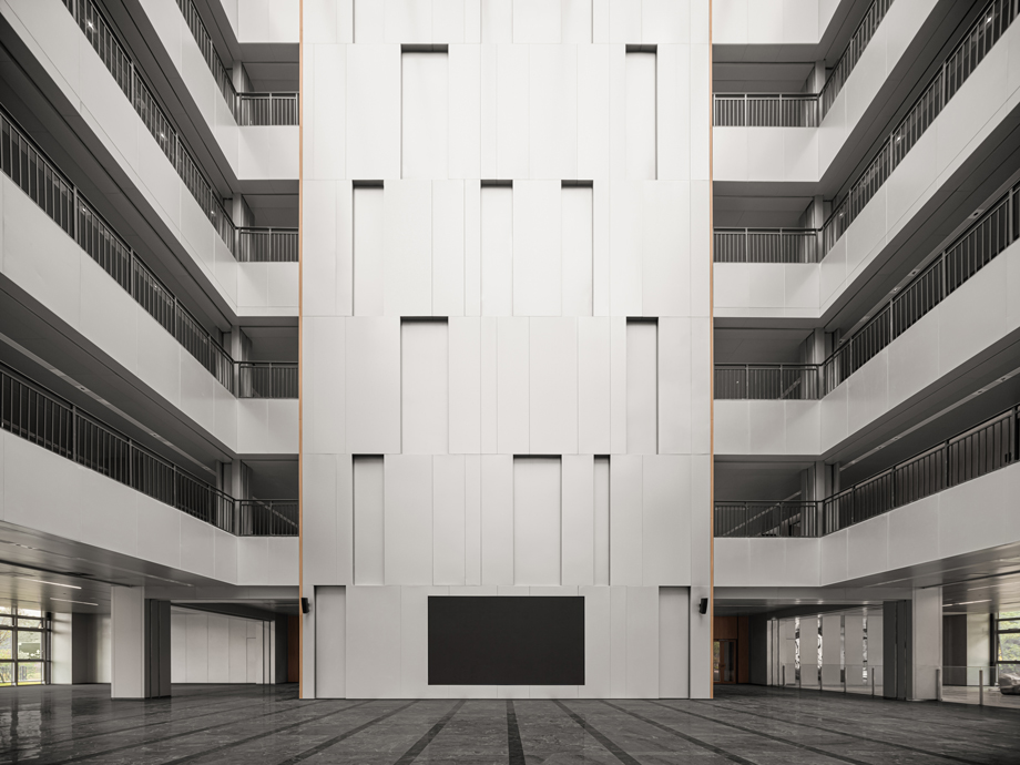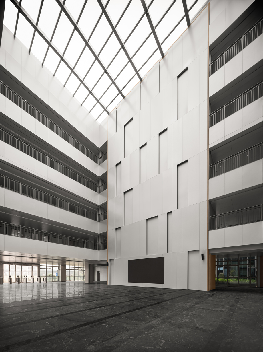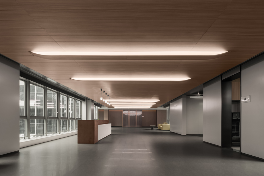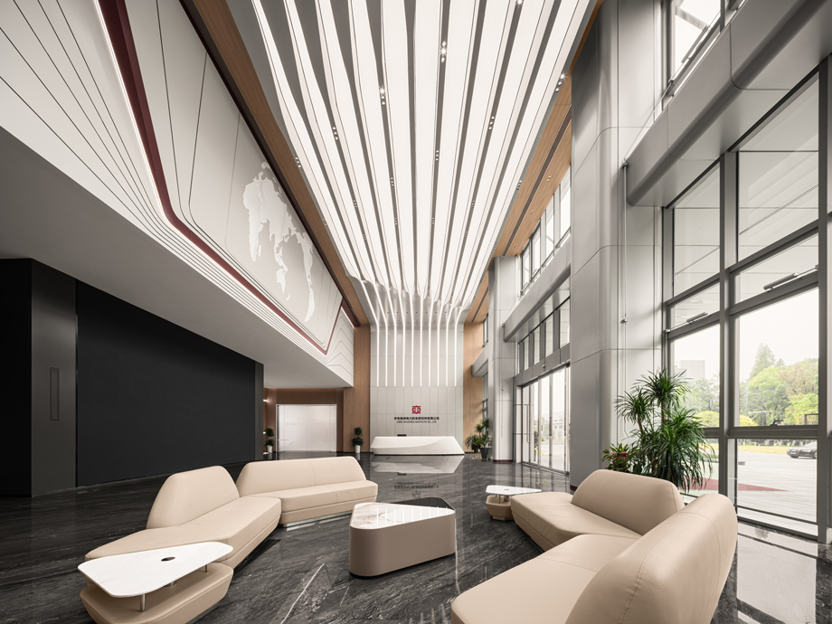 The combination of metallic with wood grains also reveals the grandness and stateliness of the overhead atrium, fitting not only the technology-based theme but also the corporate culture. As for the design of atrium, special attention is paid to modern atmosphere; modular design and rigorous sense of order are stressed to bring modern and harmonious feelings of aesthetics.
