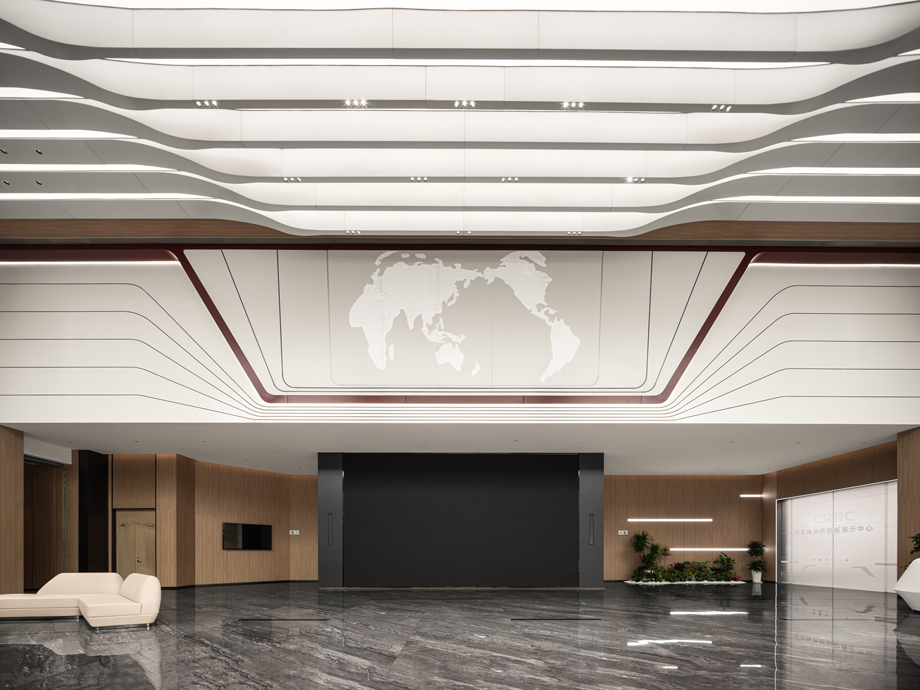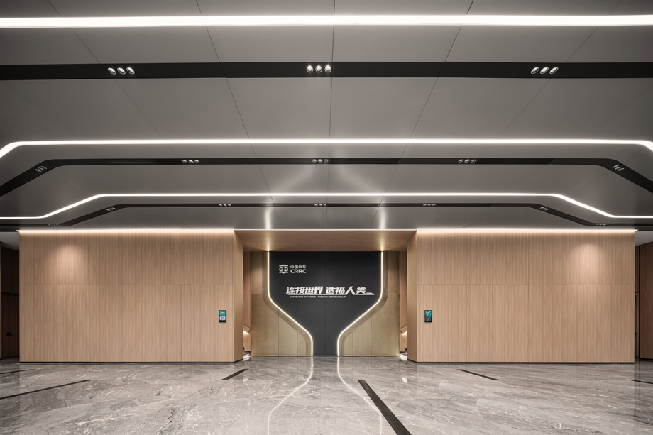 The overall design of the lobby draws on architectural elements and evolves and optimizes them, creating an integrated indoor and outdoor atmosphere as well as a symmetrical sense of ceremony. The ceiling system uses high-quality metal sheets as the main construction material, cleverly integrating with the wall design to create a harmonious and unified spatial beauty. In this exquisite layout, the central area incorporates the core concept of "CRRC Way", and through a series of planning and orderly arrangement design techniques, endows the space with infinite dynamic changes and a sense of hierarchy.