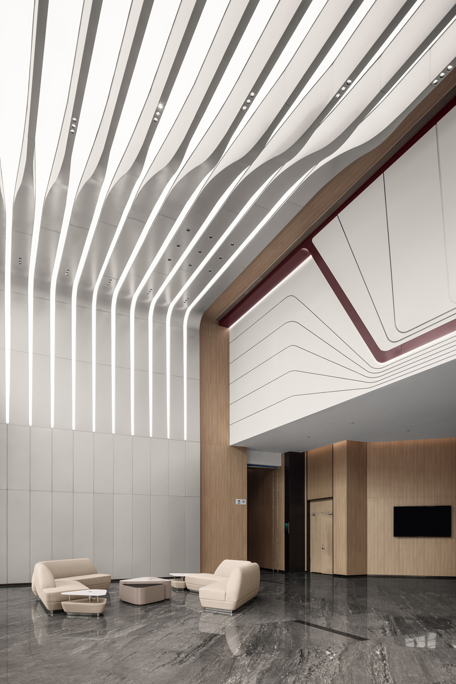 The spatial design of the entire lobby is permeated with the core concept of track elements and axis symmetry from beginning to end, creating a highly imposing and ceremonial atmosphere.
