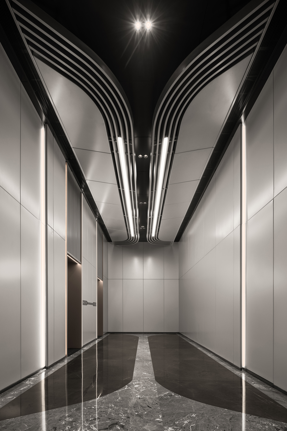 電梯廳的設(shè)計(jì)融入了軌道元素與中軸對(duì)稱的理念,延續(xù)了設(shè)計(jì)上的連貫性與深度。天花板設(shè)計(jì)以大氣與簡(jiǎn)潔為核心、整體感強(qiáng)烈,減少不必要的裝飾元素,強(qiáng)調(diào)空間的純凈與秩序,營(yíng)造出一種既開闊又精致的視覺效果。