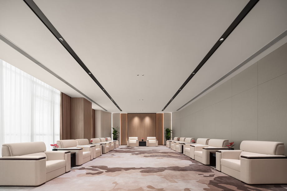 The VIP reception room breaks the traditional expression technique and focuses on creating the wall part. Combining the line elements of the theme, the wallpaper is arranged in a sequence, and the lighting is used to make the entire space more visually impactful, sequential, and ceremonial, while also satisfying the function of sound absorption.