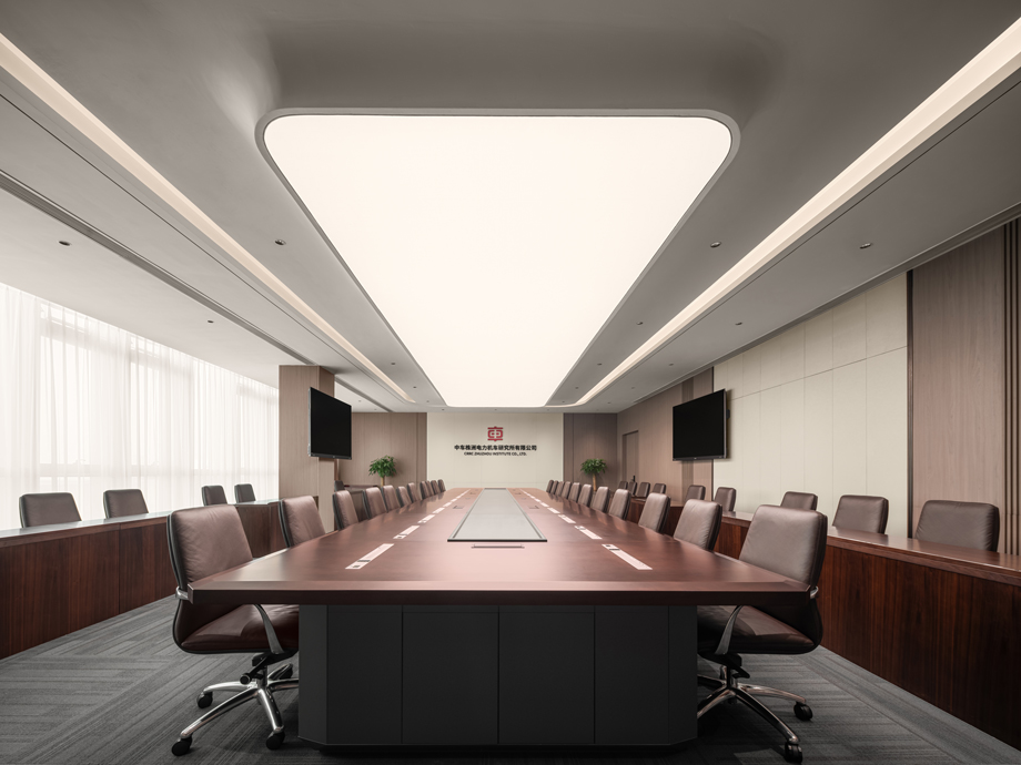 In the design of the ceiling, we concealed some of the light sources to reduce the negative impact of direct light strips on people. The overall design takes locomotives and tracks as design elements, and the wall shape is like a locomotive running at high speed on the track, combined with the concept of "CRRC Way", while also representing the beautiful intention of the enterprise's high-speed and safe development.