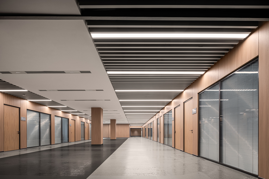 走廊的整體設(shè)計(jì)現(xiàn)代穩(wěn)重,又不失溫馨。設(shè)計(jì)提取中車元素融入天花吊頂之中,通過墻面與頂面一體化設(shè)計(jì)及有序的排列布局,將原本單調(diào)冗長(zhǎng)的走廊轉(zhuǎn)變?yōu)閷哟畏置髑页錆M儀式感的空間。