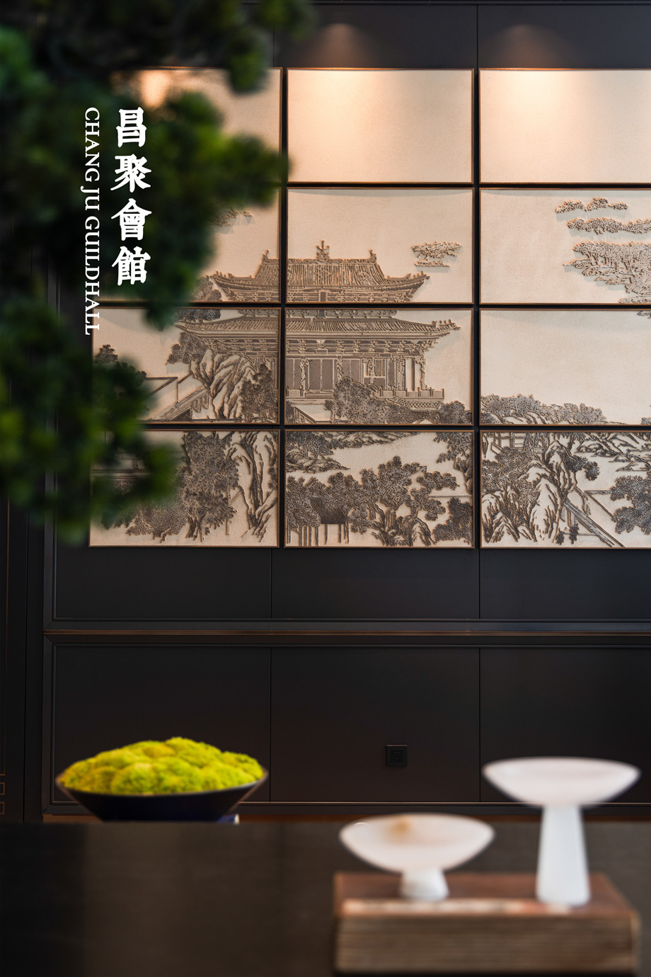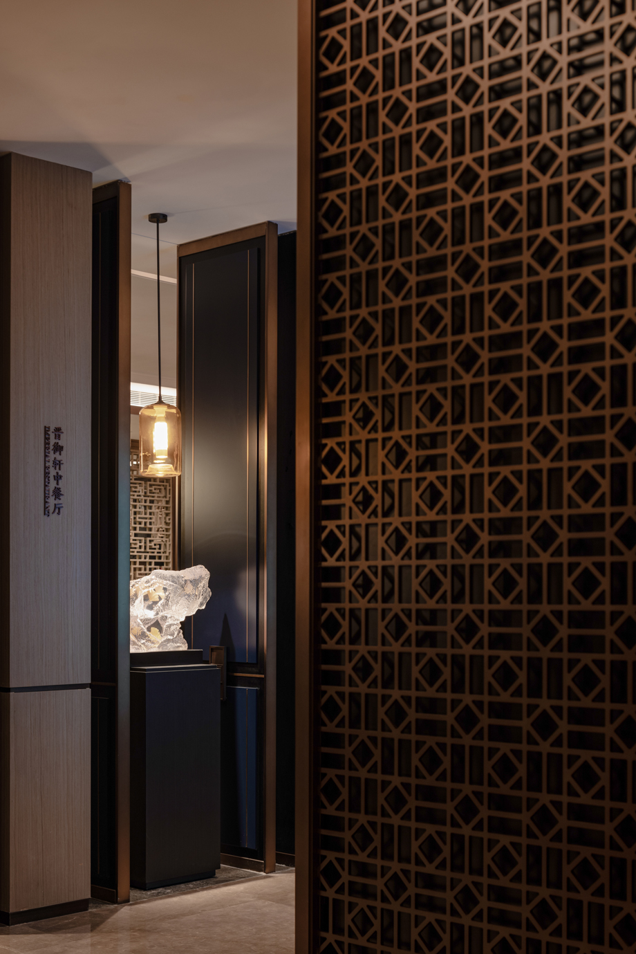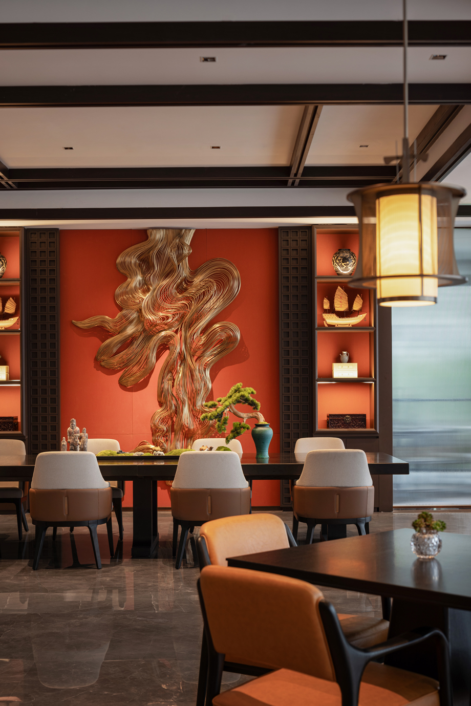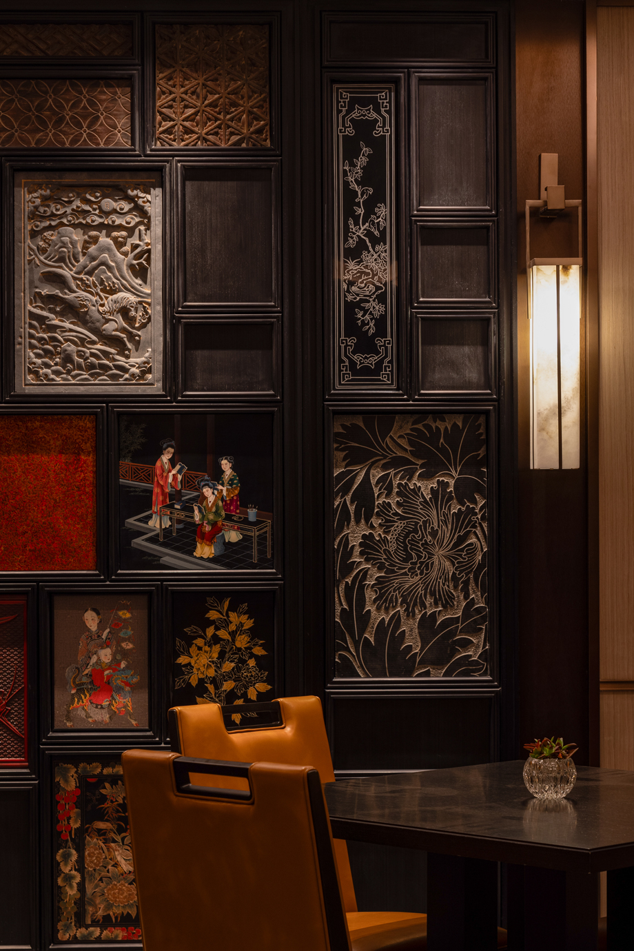 以建筑、木格漆器為元素,將山西著名的會館建筑擺件融入到建筑空間,致敬會館文化。