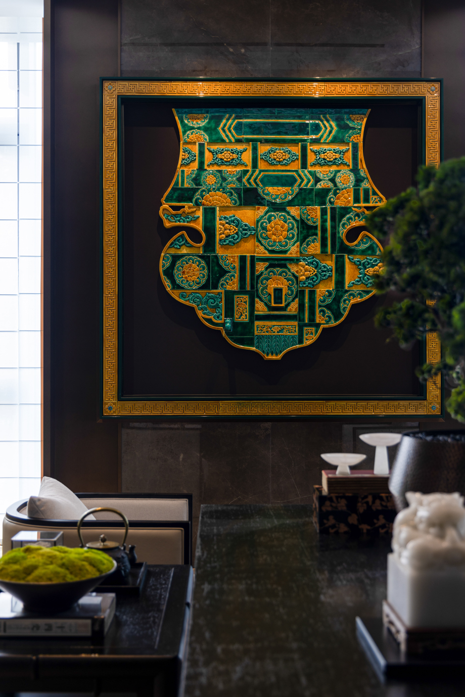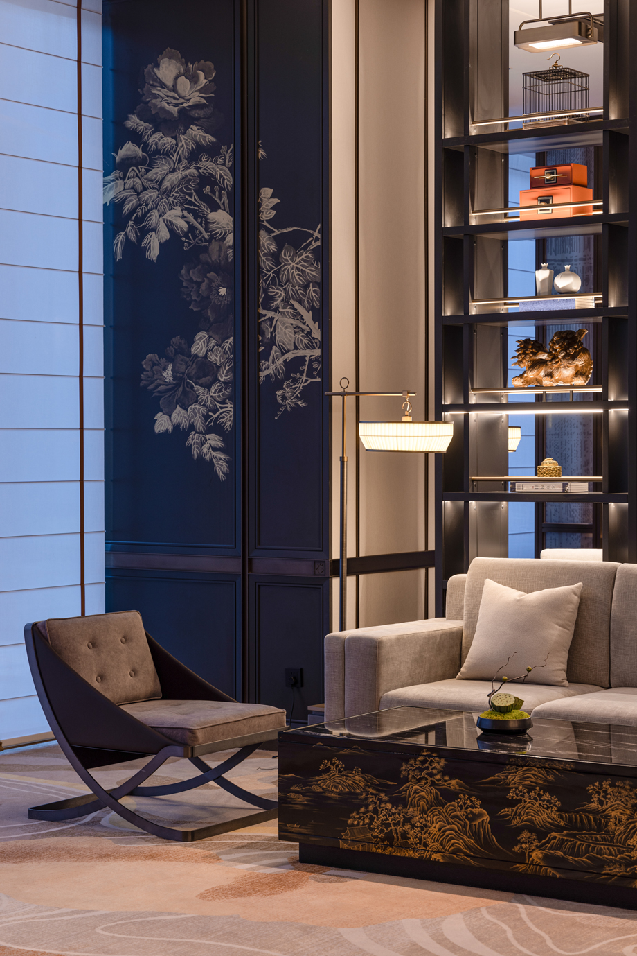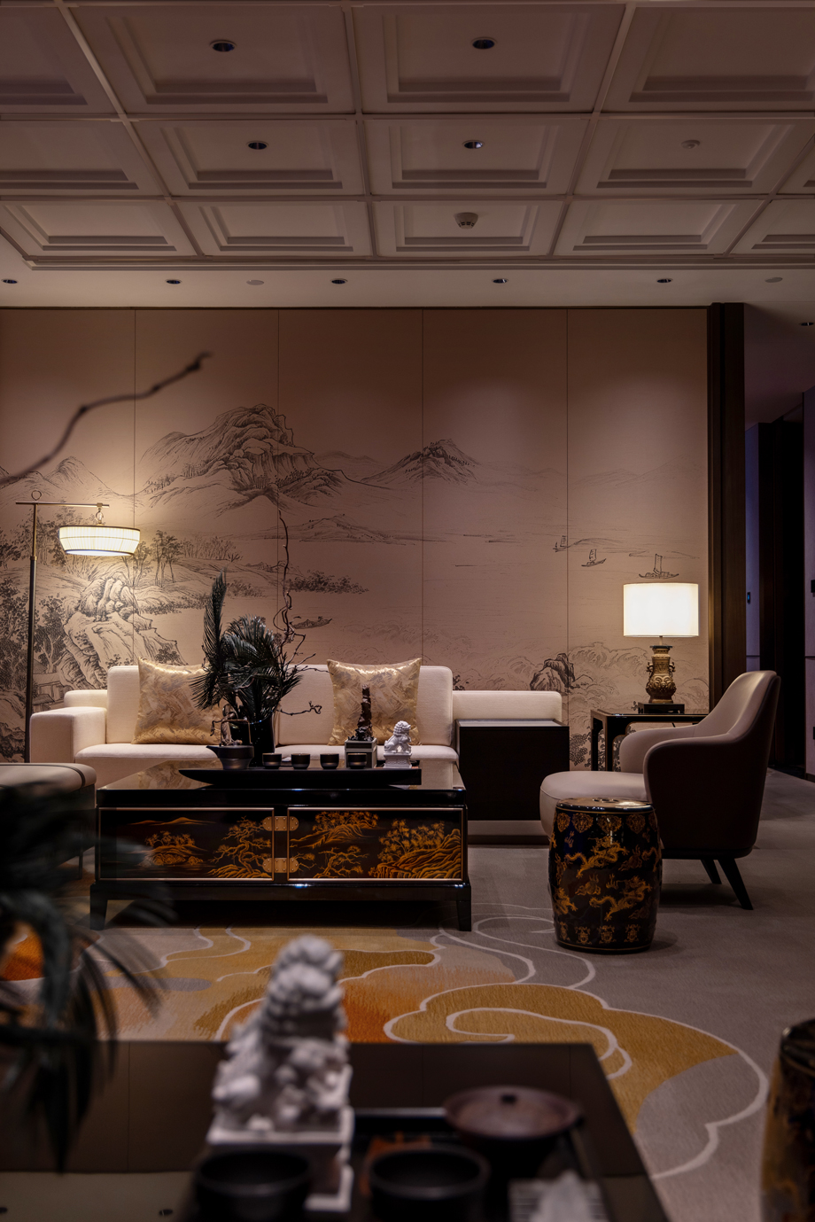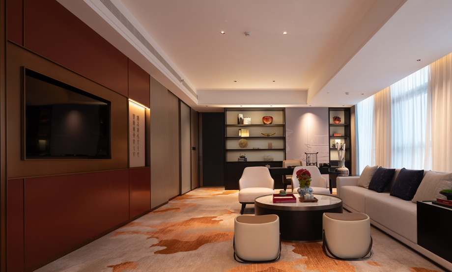 The living room style of the suite is designed based on the wisdom of Qiao's business philosophy and the cultural heritage of study. Honesty and trustworthiness are the core of the Qiao Family's business philosophy, while exquisite seals and books symbolize integrity and perseverance.