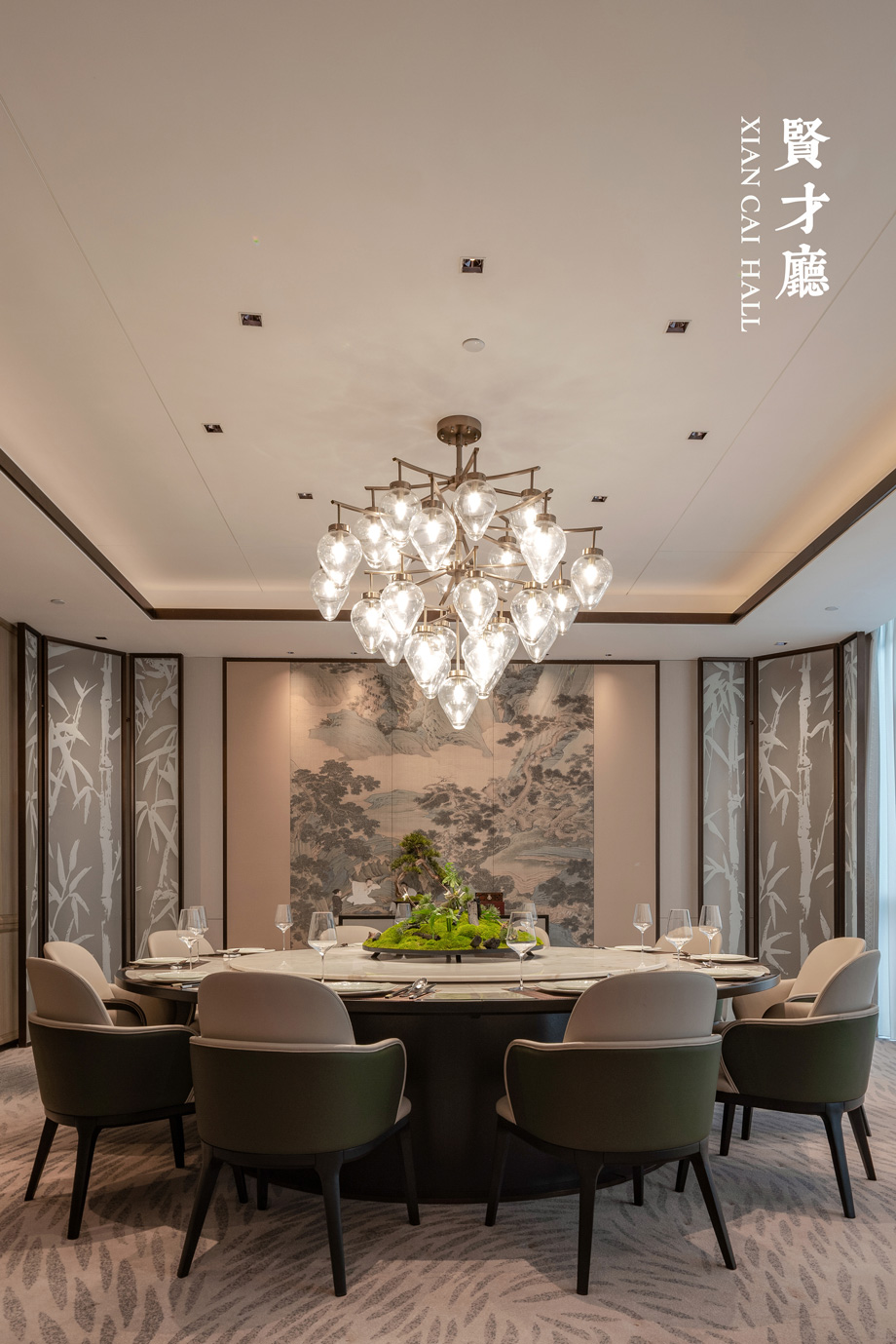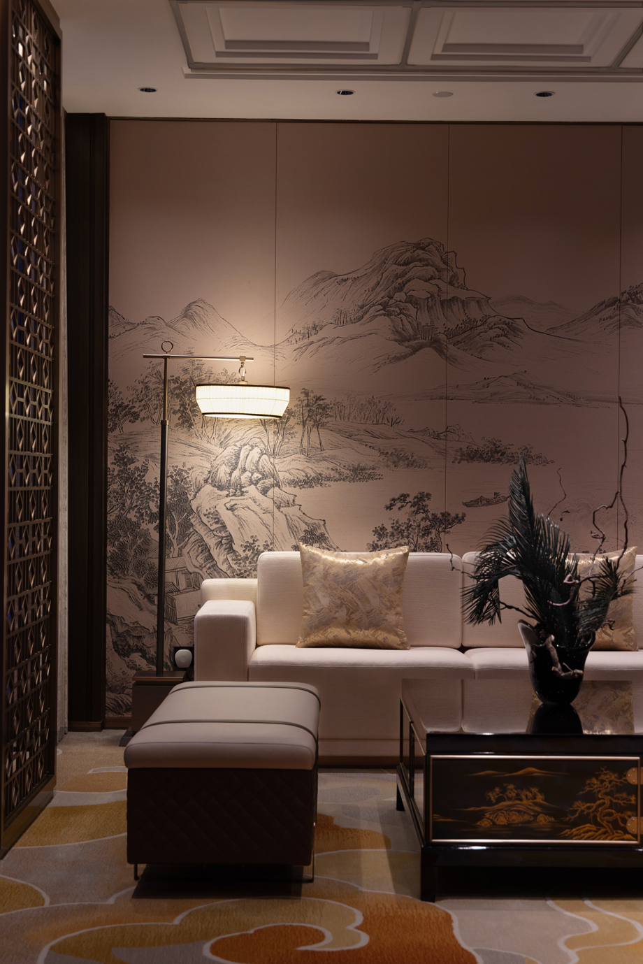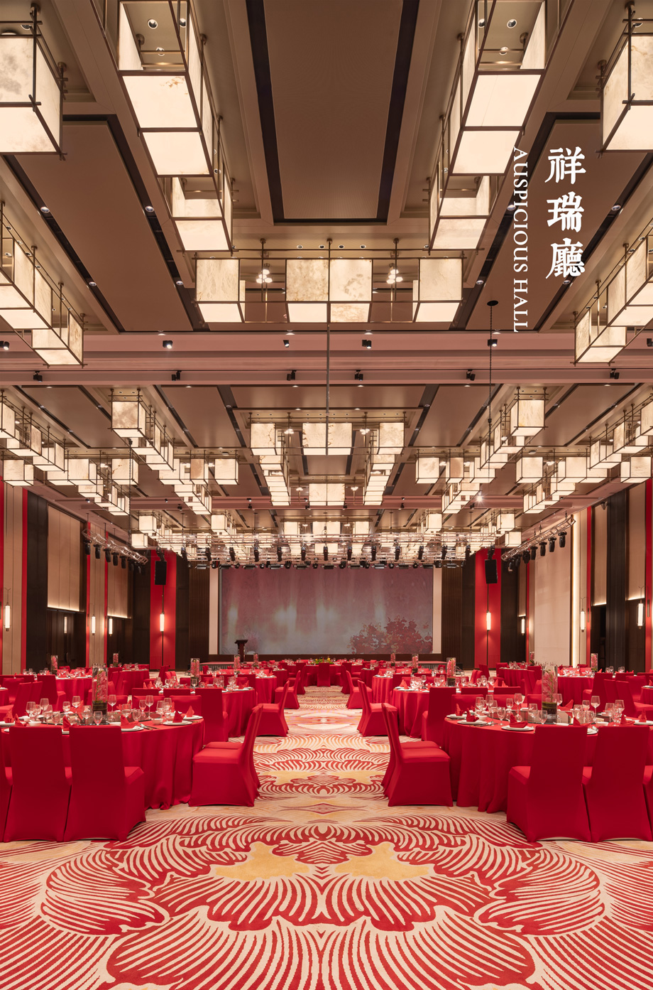 JHD applies the two Chinese characters “喜” and “吉” flexibly by taking happiness and auspiciousness culture as the concept, and uses the font elements extracted to the ceiling grids and lamp arrangement, symbolizing auspicious atmosphere and treasure. The graceful and elegant blossoming peonies symbolize auspiciousness and wealth. The carpet pattern is designed with distinctive features in combination with the space.