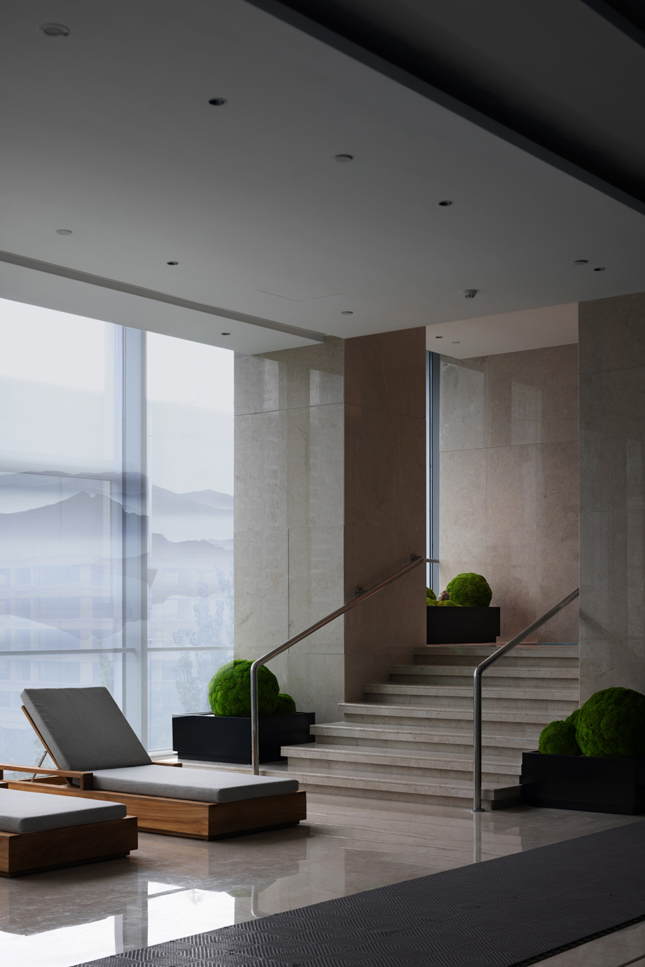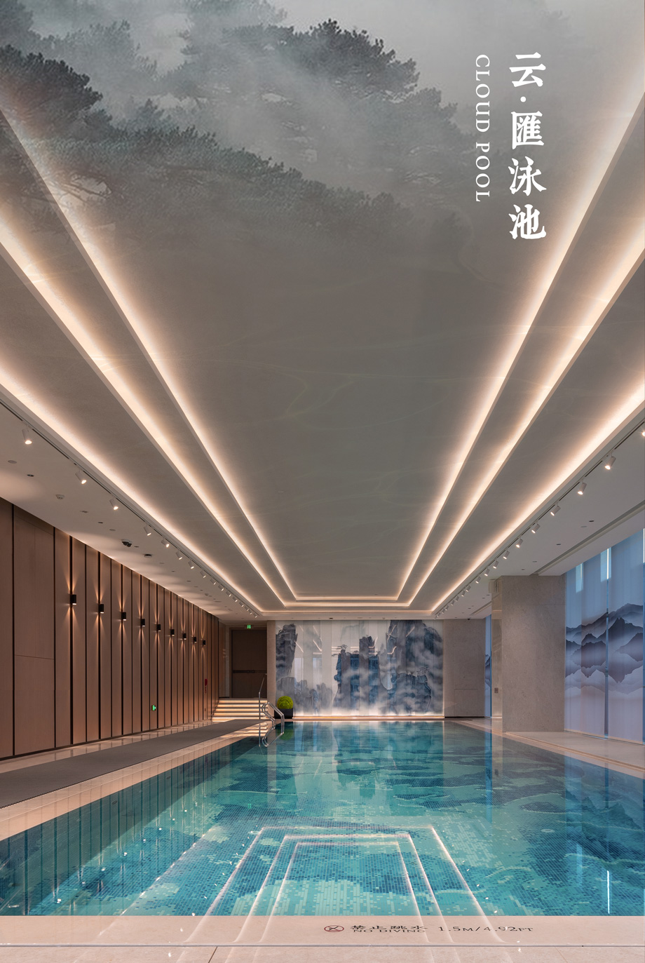 泳池空間,把山林中的青綠色引入到整個泳池的墻面部分,形成一些光影藝術(shù)墻。將疊紗的感覺在豎體上體現(xiàn)出來,山林云霧,宛如置身其中。使整個泳池空間有山林秘境之感。