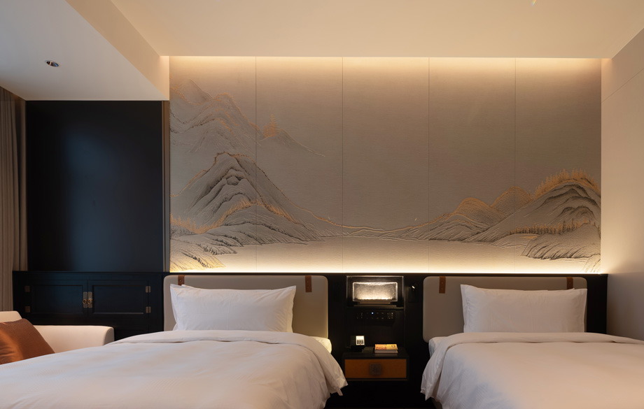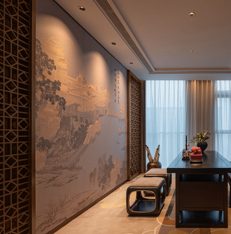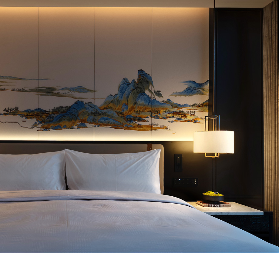The background of the bed head in the guest rooms are decorated with a painting ofthe Taihang Mountain scenery. The classical decorative style is integrated with theartistic conception of mountains and waters. A peaceful and tranquil site is designed at the foot of the Taihang Mountains, and amidst the mountains and waters, each design detail embodies the wisdom of Doctrine of the Mean as well as the upright and noble style.