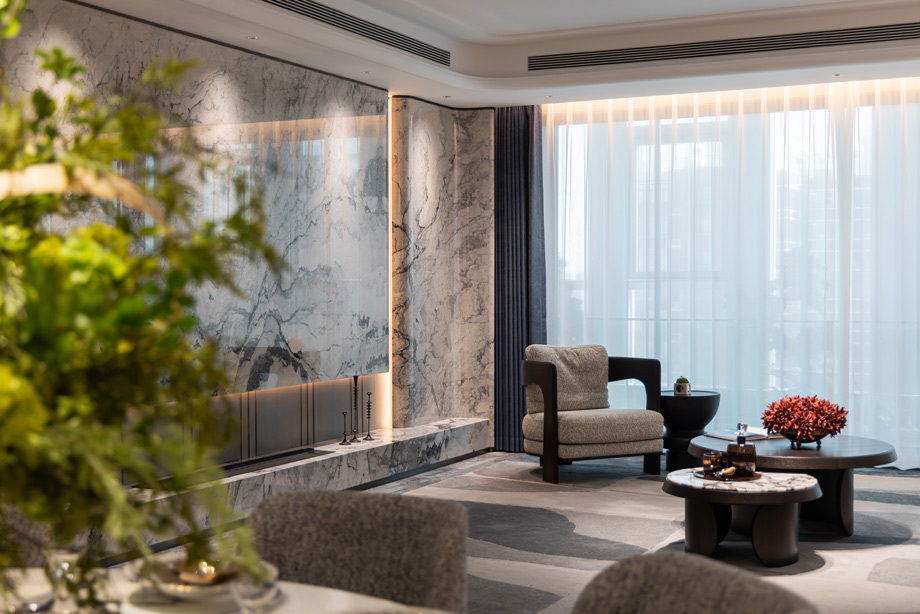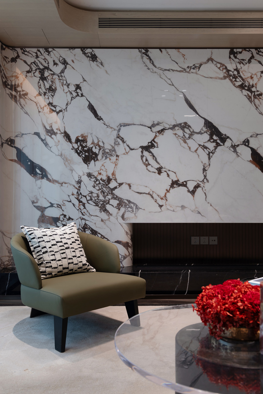寶格麗巖板凹龕如藝術(shù)展臺(tái),木飾面與金屬收邊低調(diào)中彰顯質(zhì)感,智能可視系統(tǒng)則暗藏科技的溫度。