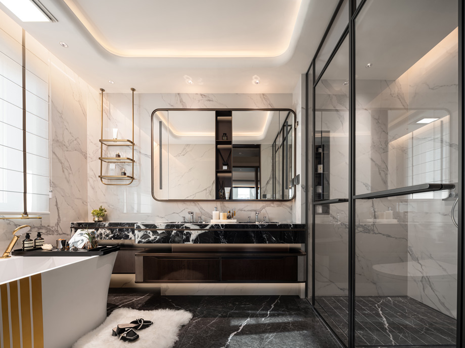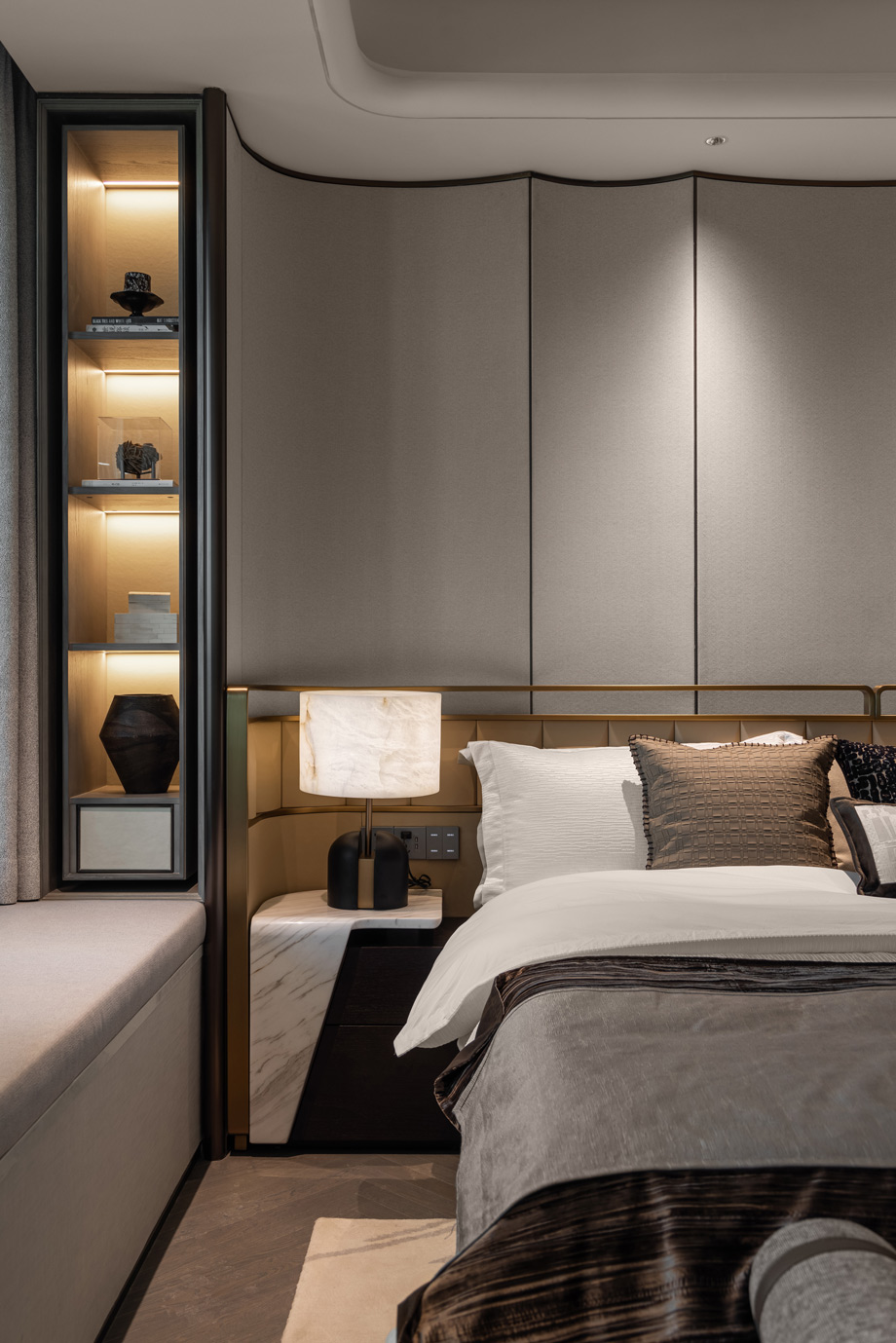 The master bedroom comes with a walk-in closet. The space extension not only enhances the sense of nobility and rituality of the master but also strikes a balance between aesthetics and practicality; wood veneer, glass, and leather materials as well as warm light together foster the sense of luxury and luxury.