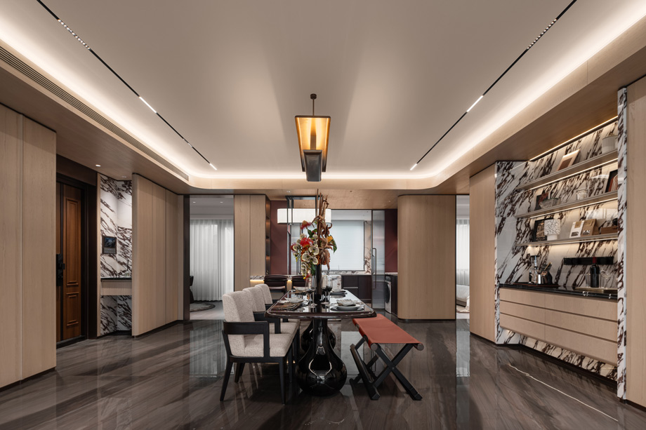 LDK一體化設(shè)計(jì)打破界限,范特西石材通鋪地面如流動(dòng)的琴鍵,串聯(lián)起西廚島臺(tái)的煙雨江南奢石、客廳壁爐的暖意,與餐桌上的琉璃器皿。