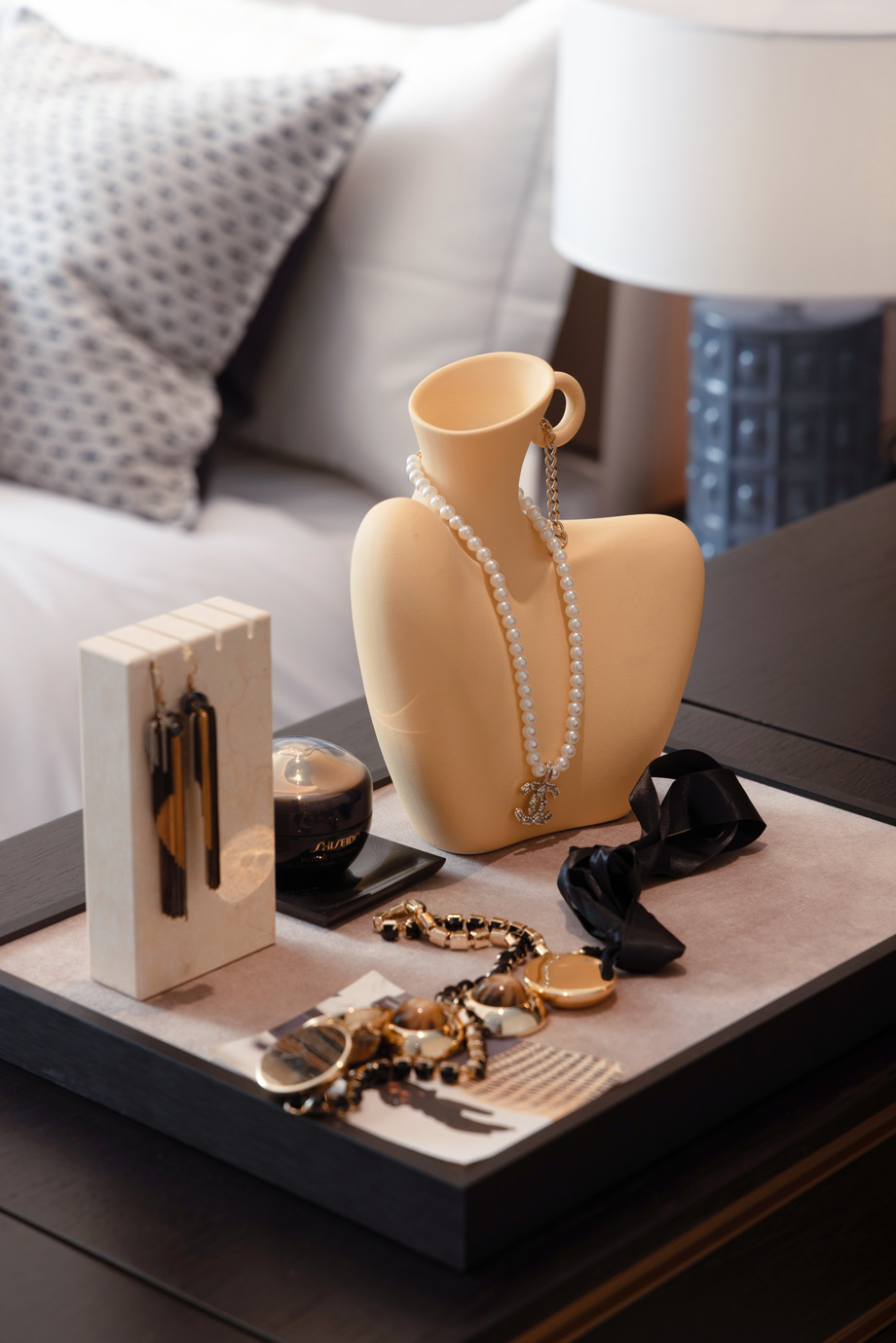 The L-shaped corner wardrobe is designed with leather and metal edges and is used for both storage and display. The bay window is designed as a mini tea table, where, when the morning light is dim, owner can have a cup of clear tea or read a book leisurely.