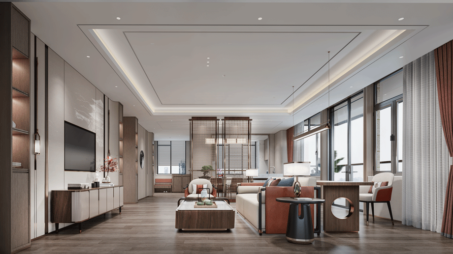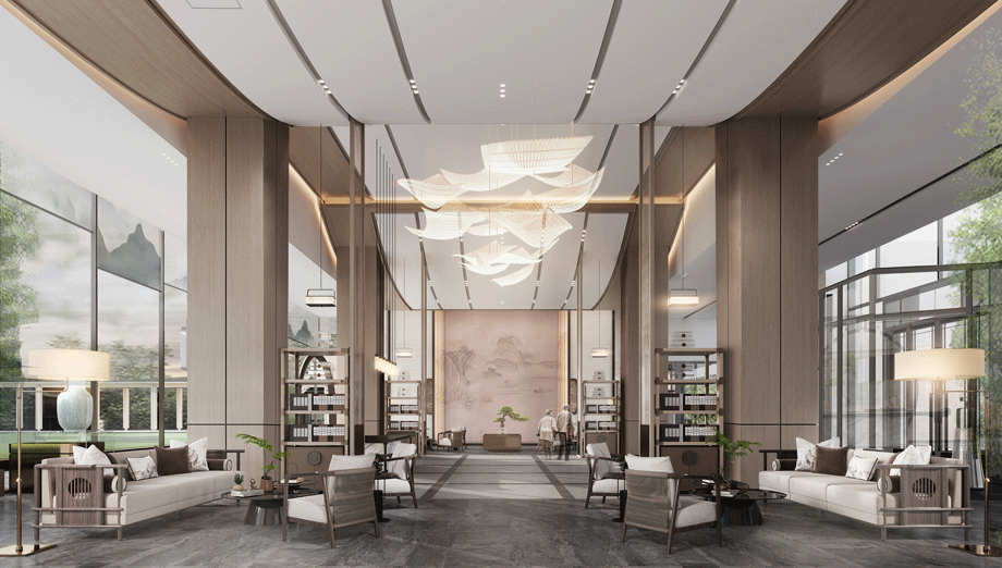 入戶大堂是整體空間的引領(lǐng)者,新中式設(shè)計風(fēng)格,吊頂造型詮釋了主體元素“濟南之山”的形式。打破常規(guī)大堂設(shè)計手法,本案營造了酒店會所的氛圍,典雅而高貴,獨特的養(yǎng)老大廳,園中園設(shè)計的融入,進一步刻畫了中式風(fēng)格。