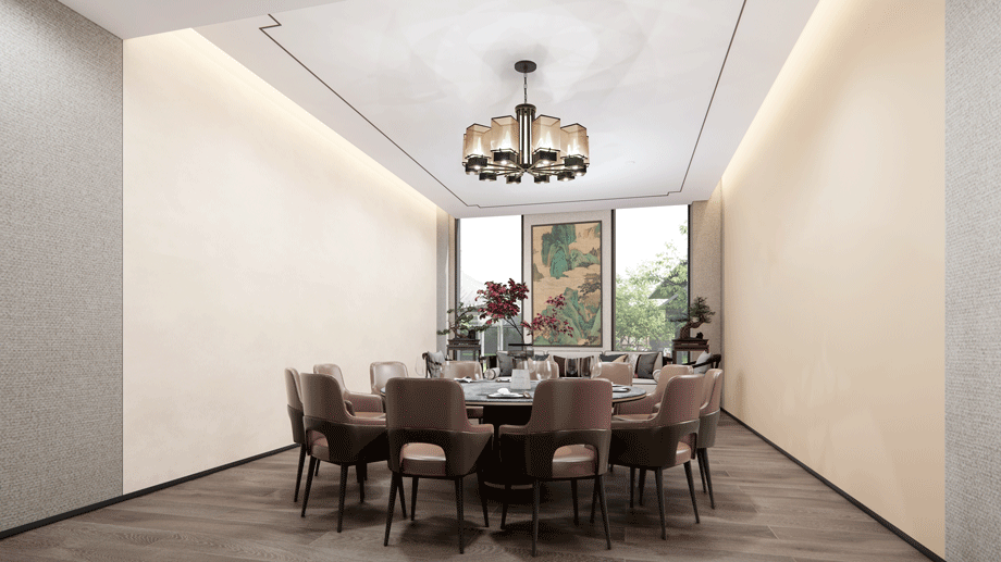 餐廳設(shè)計延升并延續(xù)了“山”元素的新中式風(fēng)格手法,普華而厚重,作為入住后使用率較高的空間,其舒適和便利的程度直接影響老年人的居住體驗。餐廳不僅是為老年人提供日常餐飲的地方,同時在非就餐期間,可對其空間進行復(fù)合化設(shè)計,滿足交流、閱讀、舉辦各種活動等,提高空間利用率。