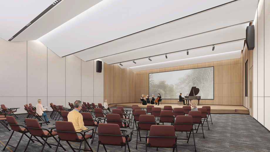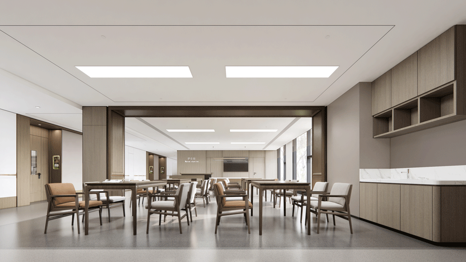 多功能廳延續(xù)了“山”的設(shè)計元素,“山”型的吊頂設(shè)計,最大化利用結(jié)構(gòu)關(guān)系,多種氛圍的燈光設(shè)計,滿足不同場景的使用。打造通高空間,光線引入中庭,營造老年人參與的活力度, 滿足老年人心理和感官的需求。