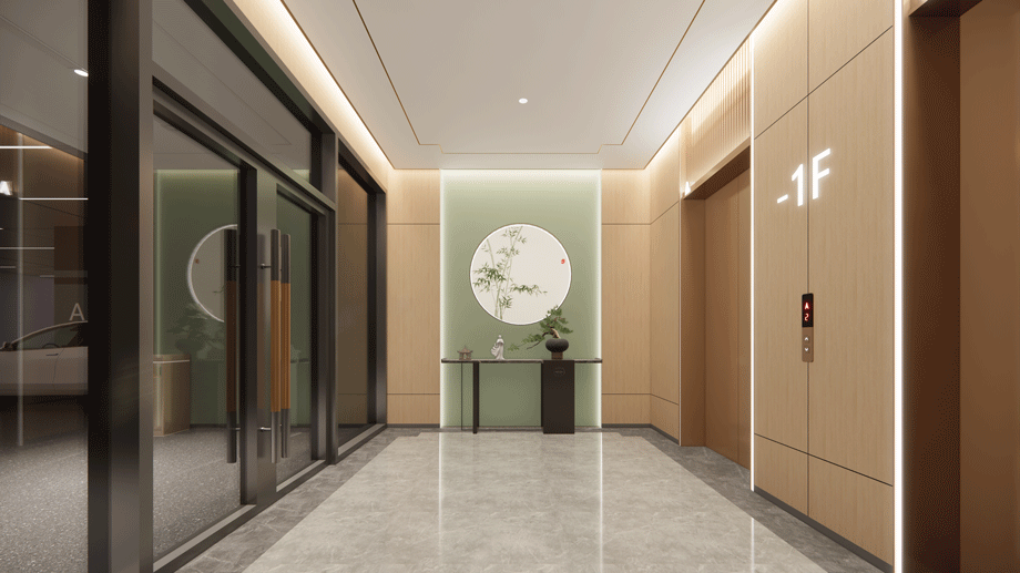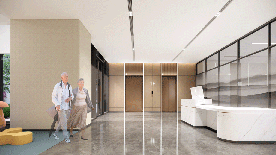 地下一層客梯廳、方便老人及家屬通過客梯到達一層或居住樓層。對客用電梯設(shè)計時應(yīng)考慮使用對象大多為老年人,兼顧水平和垂直形式和尺寸,進行適老化細(xì)部設(shè)計。