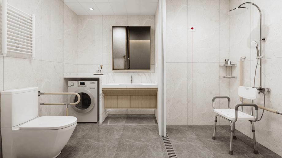 衛(wèi)生間設(shè)計中,馬桶兩側(cè)皆設(shè)置支撐扶手,方便借力;同時在其中留出足夠的空間,滿足無障礙旋轉(zhuǎn)半徑;為了避免狹小的空間使人感到壓抑,衛(wèi)生間墻面貼淺色系墻面磚,給人在心靈上帶來一種放松的感受,在視覺上給人一種空間被放大、通透的感覺。