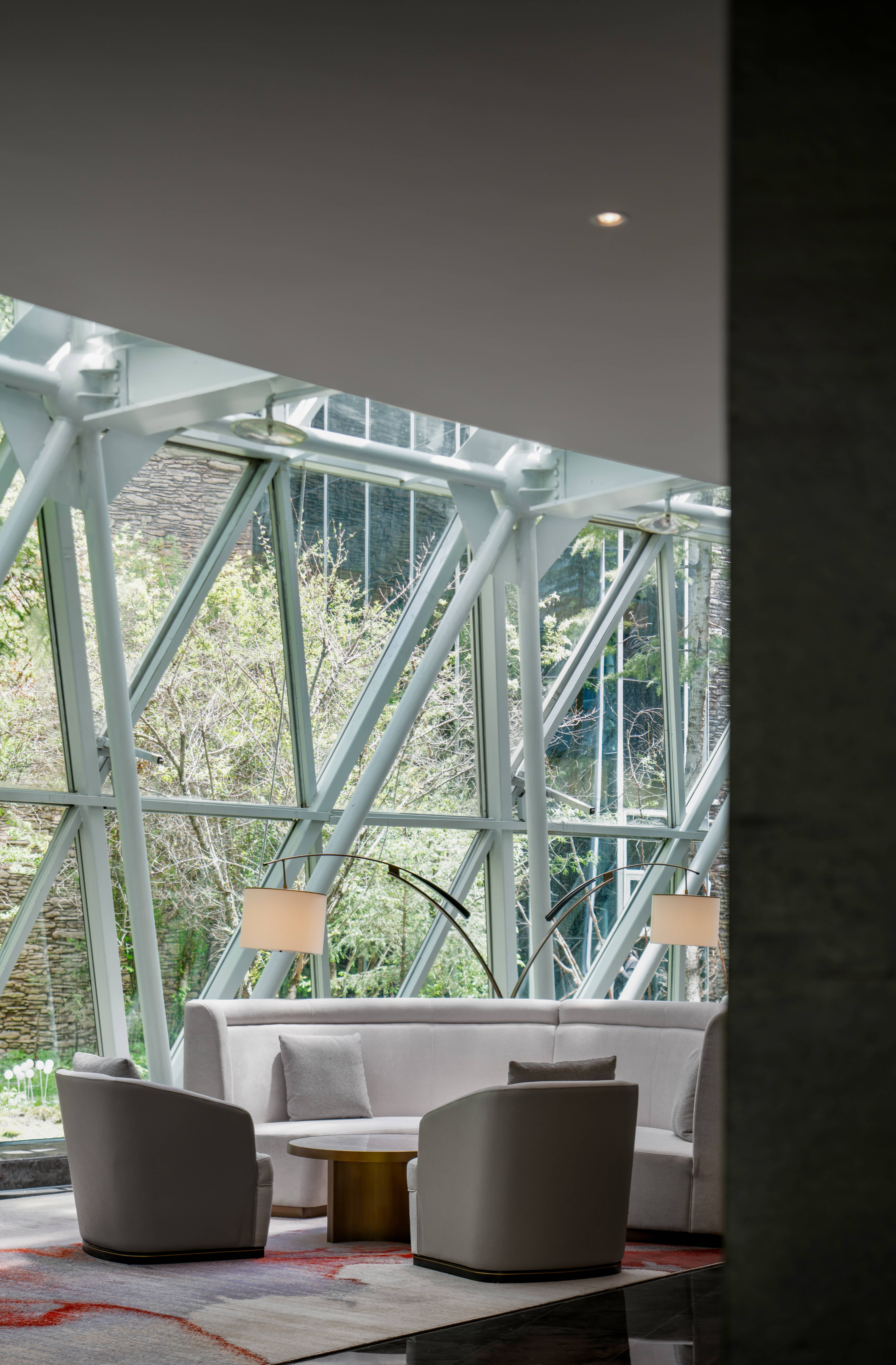大堂休息區(qū)布置在景色最好的區(qū)域,這里被自然森林所環(huán)抱,不同的時(shí)節(jié)可感受不同的風(fēng)景。