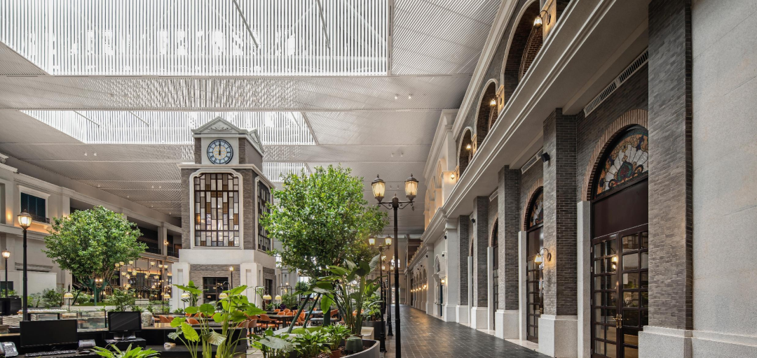 鐘樓做為民國(guó)時(shí)期市中心的一個(gè)重要地標(biāo),被運(yùn)用到共享大堂的中心廣場(chǎng)位置,廣場(chǎng)的設(shè)計(jì)是民國(guó)時(shí)代的城市建設(shè)縮影,共享大堂做為施柏閣大觀酒店與皇冠酒店的大堂吧及全日餐使用,立面上使用軟磁材料,塑造民國(guó)風(fēng)立面,打造民國(guó)街區(qū),伴隨著悠悠的鐘聲將人民帶回那個(gè)激蕩而浪漫的年代。