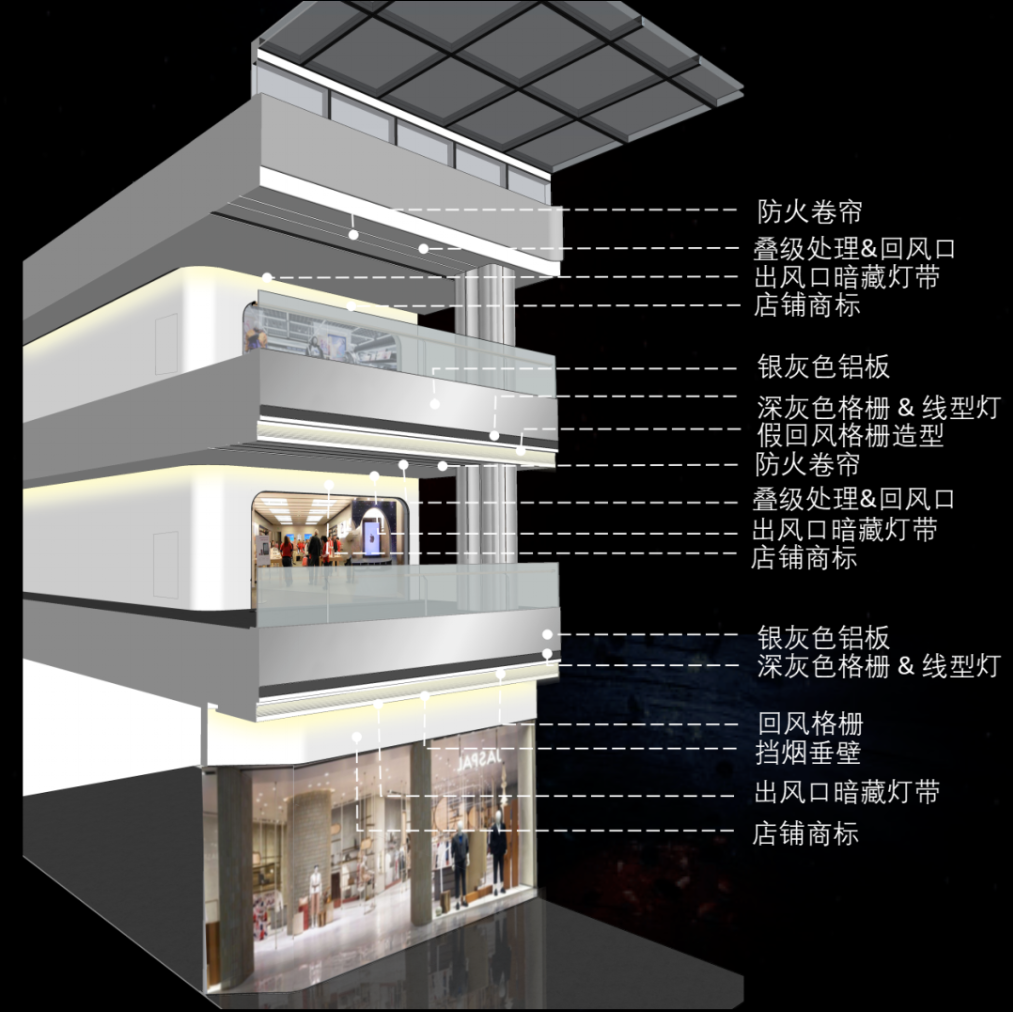通過(guò)金屬材質(zhì)的反射質(zhì)感和LED線性燈條打造成富含感科技入口,從這里進(jìn)入商場(chǎng)有一種登入未來(lái)太空飛船的體驗(yàn)感。