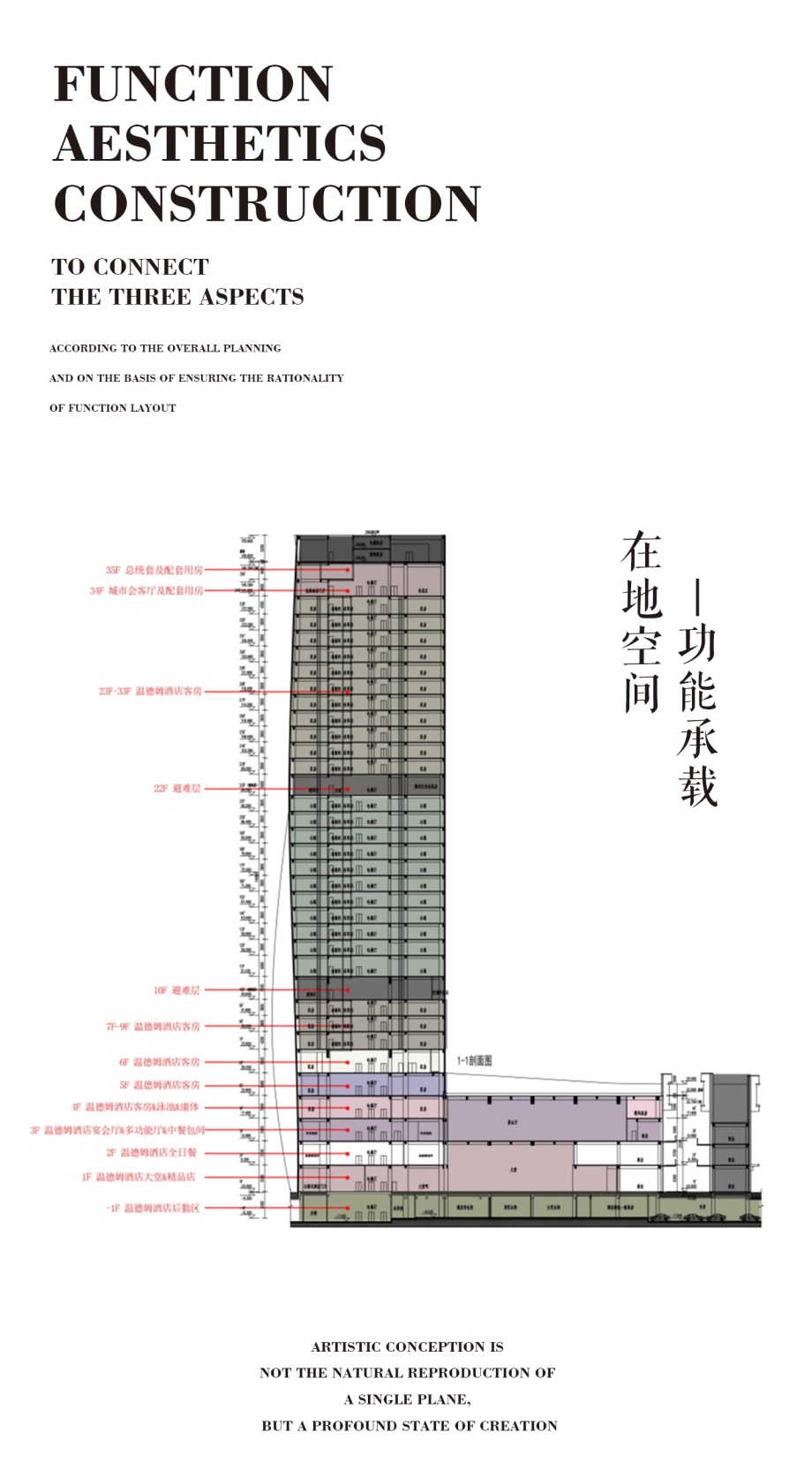 In terms of construction, “room”, “hall”, “gallery”, “floor well” and “mezzanine” echo with the space in the hotel one by one by taking advantage of the spatial elements. To be specific, “room” echoes with the residential space, “hall” with the reception space, “gallery” with the traffic space, while both the “floor well” and “mezzanine” with the public space.