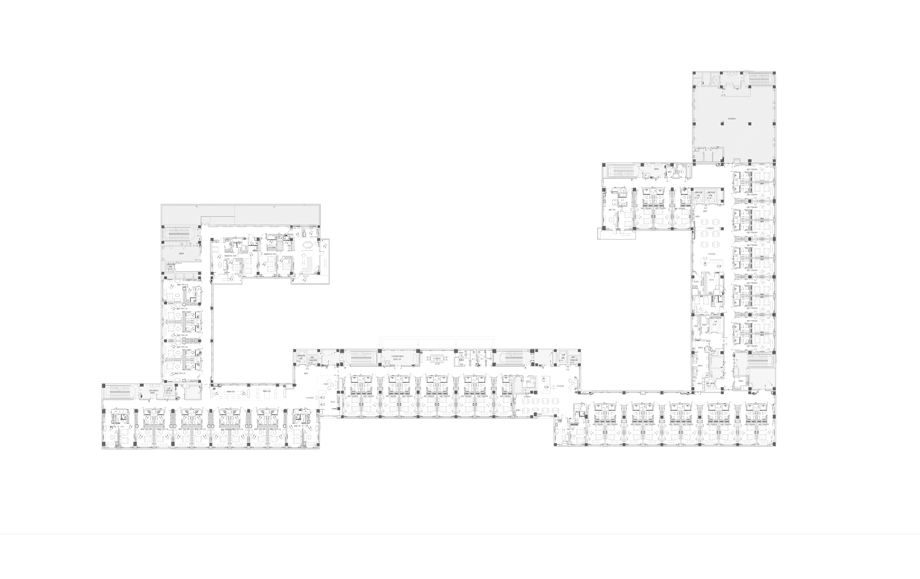 從平面布局圖上可以看出,居室都以單人間的模式一字排開,在公共走道與建筑體量的轉(zhuǎn)接處安排了醫(yī)療護理區(qū)域與公共活動區(qū)域。截取居住體量的一段可以發(fā)現(xiàn),走廊的端頭位置都是供居住單元內(nèi)的老人平日活動的區(qū)域。